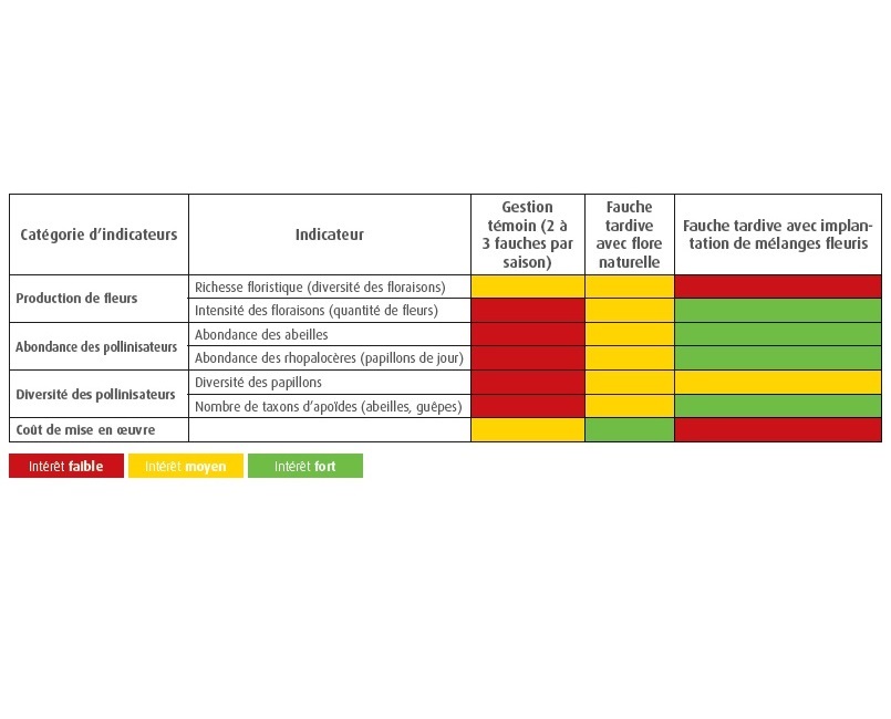 L'expérience aboutit à une production florale beaucoup plus importante lors d'un fauchage tardif (par rapport à la gestion témoin), bien qu'elle ne soit pas plus diversifiée. Les conséquences sont une disponibilité accrue en ressources alimentaires pour les pollinisateurs qui sont donc davantage attirés.