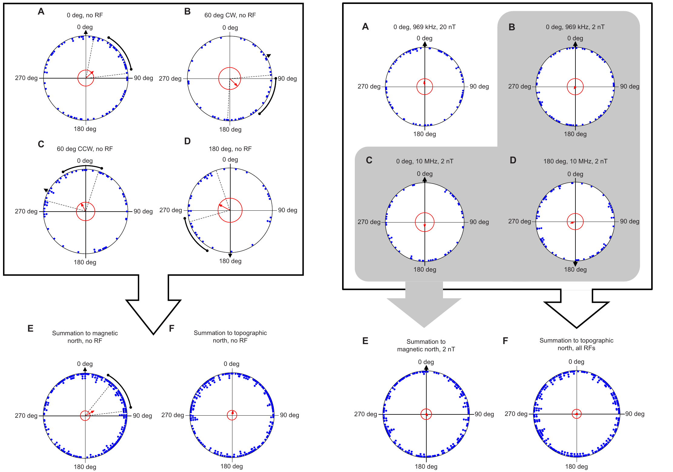 Chacun de ces groupes a été testé pour différentes orientations du champ magnétique de fond : Champ magnétique terrestre (naturel), champ magnétique incliné de 60°, 180° et 270° par rapport au champ magnétique terrestre.