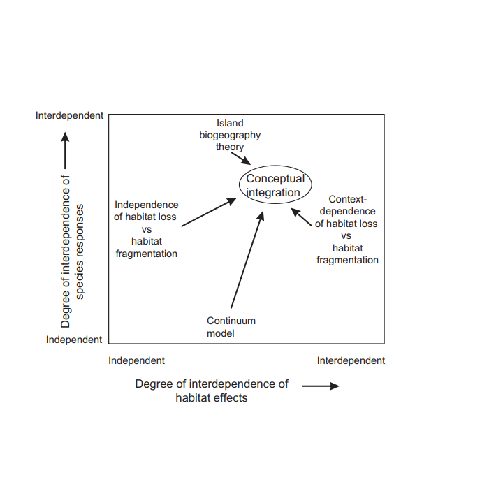 Les études sur la fragmentation sont nombreuses, et les approches diffèrent en fonction des auteurs (échelles d’étude, méthode, et définition de la fragmentation). Deux points de vue principaux sont opposés : l’indépendance de la fragmentation et de la perte d’habitat (Fahrig, 2003), ou une interdépendance de ces deux facteurs. La réponse des espèces est également scindée en deux catégories : toutes les espèces ont la même réponse à la perturbation (théorie de la biogéographie insulaire), ou chaque espèce à une réponse qui lui est propre. Les différentes approches utilisées considèrent donc des degrés de dépendance des effets de l’habitat et de la réponse des espèces différents (figure 1). Les auteurs proposent une vision plus intégrative, en considérant que chacune des alternatives (indépendance ou interdépendances des variables) ne peuvent pas être généralisables. Cependant, l’interdépendance des effets de la perte d’habitat et de la fragmentation, ainsi que l'interdépendance de la réponse des espèces serait la norme.