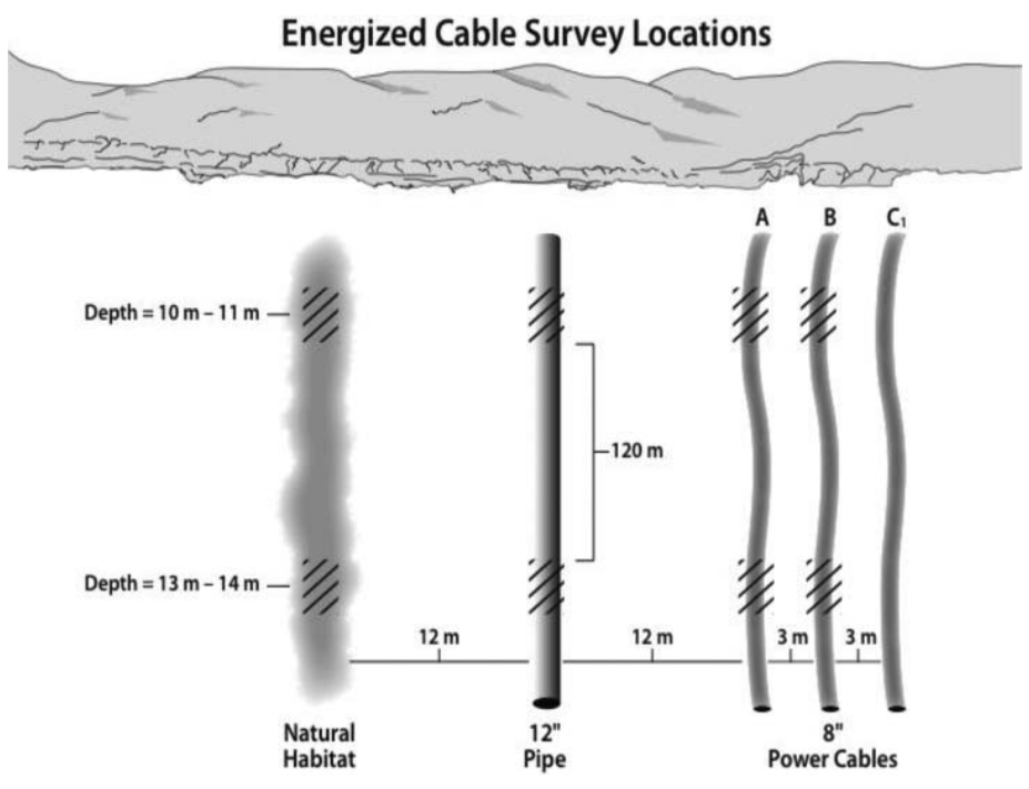 L'expérience a été menée par plongée le long de la côte de Las Flores Canyon sur 2 ans et a consisté en l'observation de communautés de poissons, d'invertébrés et macrophytes marins vivant autour de deux câbles sous-tensions, d'une canalisation et d'une localisation proche d'un habitat naturel (S. Californie) (Fig. 1). Les 2 câbles génèraient un MF de 73 µT et 91.4 µT. Les chercheurs ont d'abord travaillé sur le câble A (Fig. 1) jusqu'à ce que celui-ci ne soit plus sous-tension (15 Mai 2013), moment à partir duquel les auteurs ont décidé de continuer les observations sur le câble B.