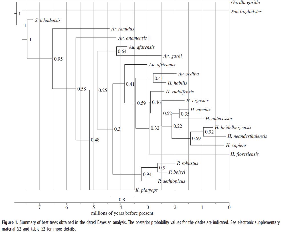 1) A. sediba ; Découvert en 2010 en Afrique du Sud. Différentes hypothèses ont été proposées pour relier A. sediba aux membres du genre Homo (A. sediba comme espèce sœur d'A. africanus, _A. sediba comme espèce sœur de tous les Homo et pouvant ainsi être leur ancêtre, etc.). Parmi ces hypothèses, la mieux supportée par l'analyse bayésienne est celle plaçant A. sediba comme appartenant au clade des Homo et pouvant ainsi être leur ancêtre.