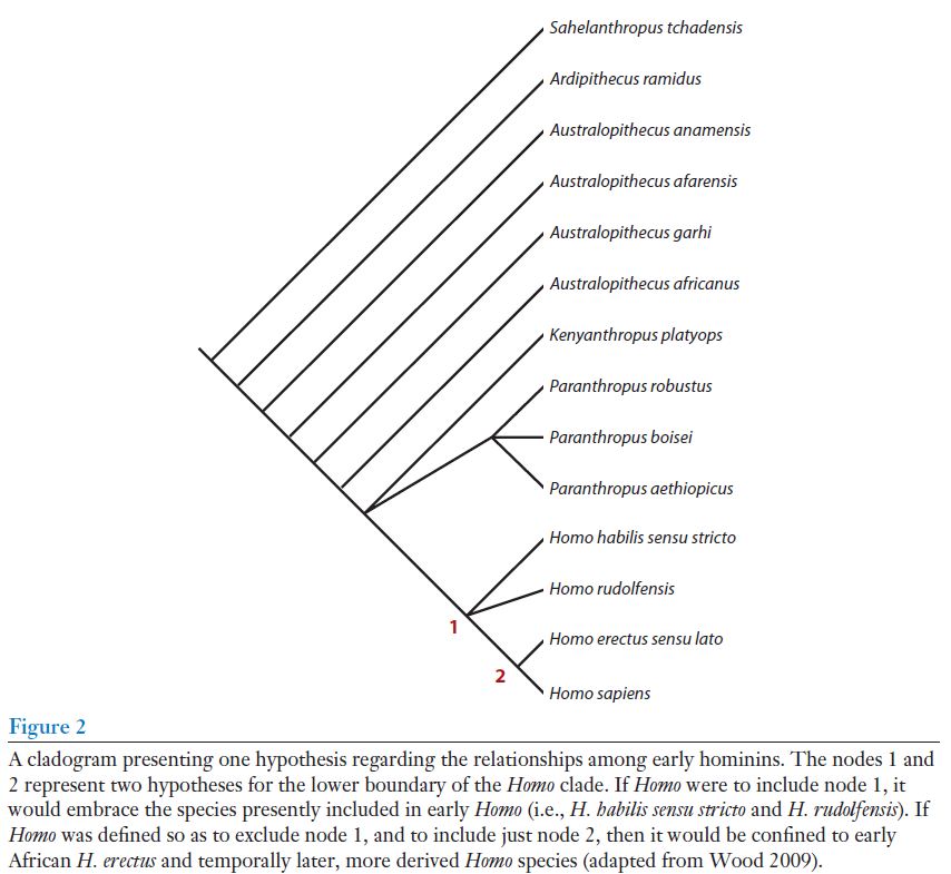 Actuellement, le genre Homo comprend H. sapiens, H. neanderthalensis, H. heidelbergensis et H. erectus. Qu'en est-il de H. habilis et H. rudolfensis ? (Figure 2). Il semblerait qu'ils devraient également être inclus dans le genre Homo, cependant les indices permettant de les placer chez Homo ne sont pas aussi forts que ceux utilisés pour inclure les autres espèces.
