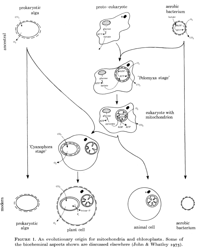 Origine évolutive des mitochondries et des chloroplastes (John & Whatley, 1975)