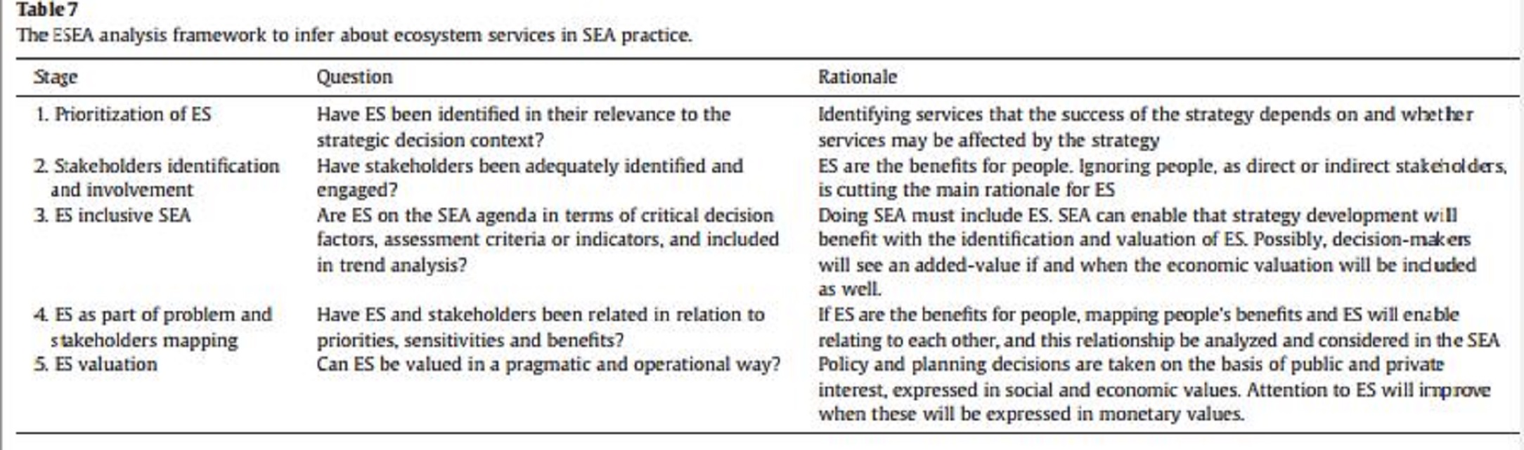 La review montre que les services écosystémiques sont intéressants pour les études d'impact environnemental et les évaluation stratégiques, mais qu'ils sont très peu utilisés en pratique.