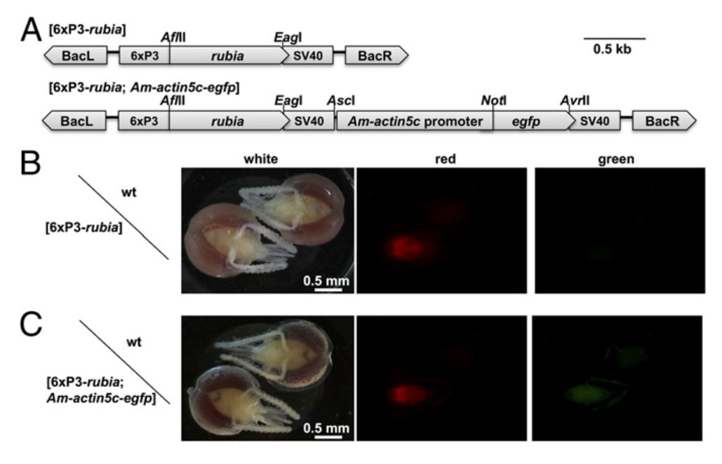 Les auteurs ont utilisé le transposon piggyBac (séquence ADN qui va s'insérer dans l'ADN de l'organisme) pour insérer deux transgènes chez l'abeille domestique. Nommés rubia et egfp, ceux-ci, une fois exprimés, induisent une fluorescence dans la tête des larves, ce qui permet de vérifier le succès de leur intégration.
