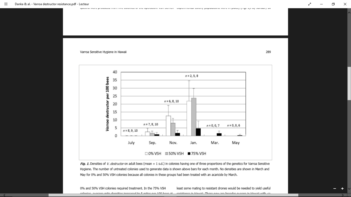Dans les groupes 0% VSH et 50% VSH, les densités d’acariens sont passées de 0,10 acariens pour 100 abeilles lorsque les reines ont été établies en juillet, à 22-24 acariens pour 100 abeilles en janvier. Ces deux groupes ont nécessité un traitement en janvier. Dans les colonies 75% VSH, les densités moyennes d’acariens augmentaient jusqu’à 5 acariens pour 100 abeilles après 4 mois d’expérience et ensuite diminuaient jusqu’à 0,5 acariens pour 100 abeilles après 8 mois. Une seule colonie 75% VSH a eu besoin d’être traité après 4 mois d’établissement, au cours du test de 8 mois.