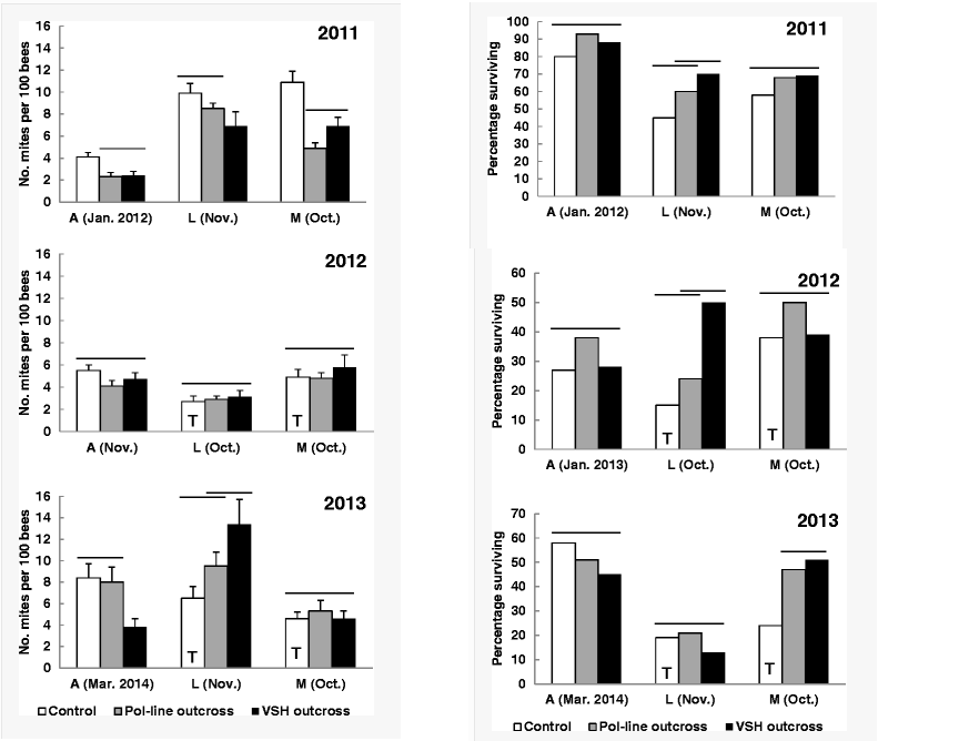Cet article est important pour le débat. Il indique que d'autre essais sont réalisés pour tenté de sélectionner par d'autre voix des abeilles plus résistantes que les abeilles hygiénistes. Ces résultats sont encourageant mais son variable selon la localité et la période ou l'on réalise le comptage (notamment entre octobre et novembre). La réalisation de croisement d'abeille résistante et de création des lignées "Pol-line" semble donc ici encourager l'idée d'une sélection de caractère pour la survie des colonies. La sélection de ces abeilles "pol-line" présente un but financier mais également un objectif de diminution de l'utilisation des acaricides, qui sont néfaste pour la santés des colonies d'abeilles (comme présenté ici).