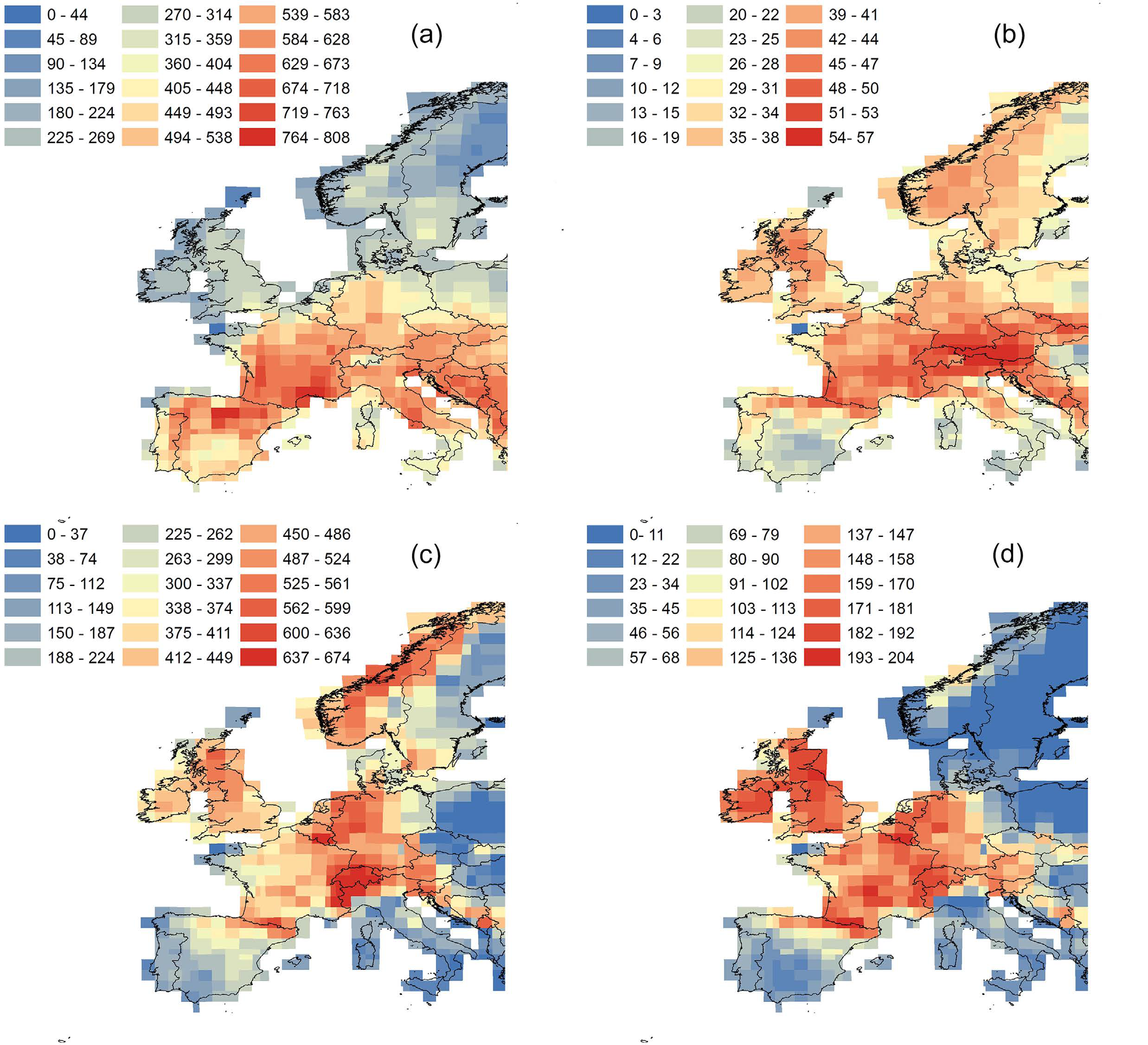 Figure 1 : Potential species richness of spermatophytes (a), ferns (b), mosses (c) and liverworts (d) across