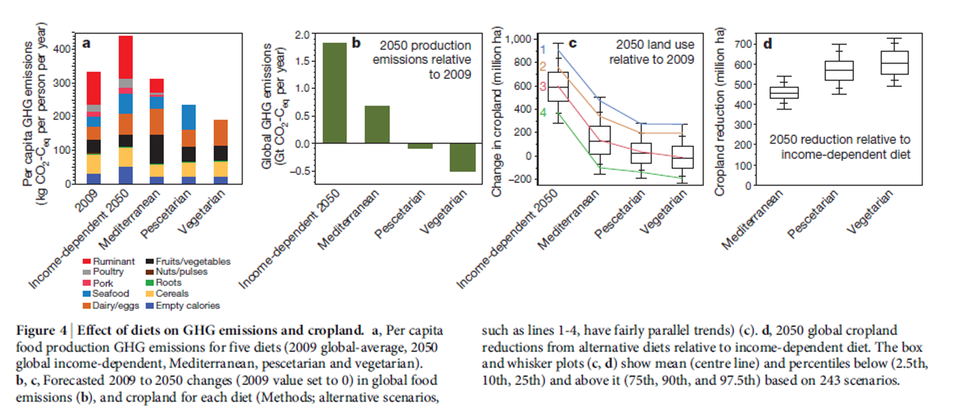Premièrement grâce à l'analyse de 120 publications sur 555 LCA d'émissions de GEC ( gas à effets de serres), on évaluer l'émission de CO2 de différents groupes d'aliments. Ensuite, ils ont estimé la demande de terres de 2050 pour voir si les régimes alimentaires alternatifs ont des différences constantes dans leurs demandes de terres, même en tenant compte d'une gamme de scénarios (243 scénarios) de développement agricole mondial futur, représenté par des suites de valeurs pour les rendements futurs, les déchets alimentaires, la productivité des pâturages, L'efficacité et le commerce agricole.Puis pour chaque régime alimentaire (dépendants du revenu, méditerranéen, pescétariens et végétariens), ils ont prévu les terres cultivées nécessaires en 2050 pour chaque scénario (chacune des 243 combinaisons de trois valeurs pour chacune des cinq variables)