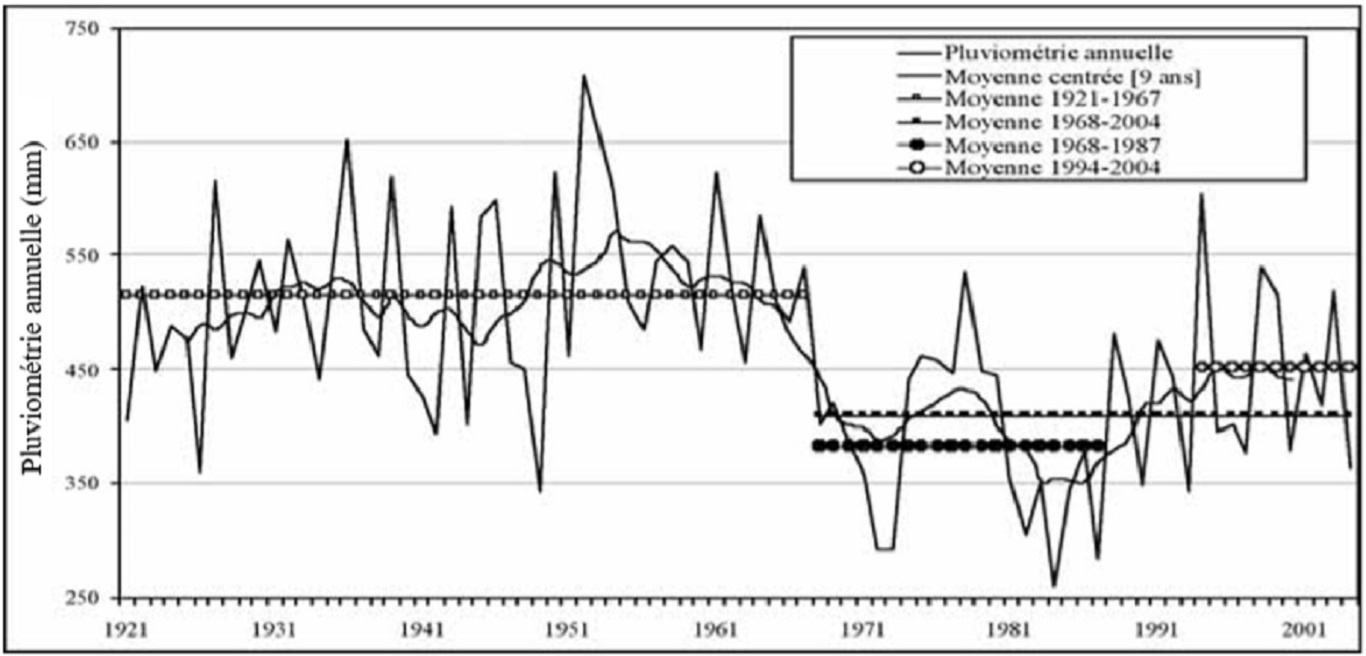 L'analyse de la pluviométrie au Niger a permis de mettre en évidence une seule réelle rupture climatique en 1967 (Figure), suivi d'une amélioration des précipitations jusqu'à aujourd'hui. De plus, des études montrent que depuis 1968, le nombre de jour de pluie a été significativement modifié (Tarhule & Woo, 1998) sachant qu'entre 1940 et 2002 on observe une diminution significative du nombre de jour de pluie par décennie et une augmentation significative de l’intensité pluviométrique moyenne par jour de pluie.