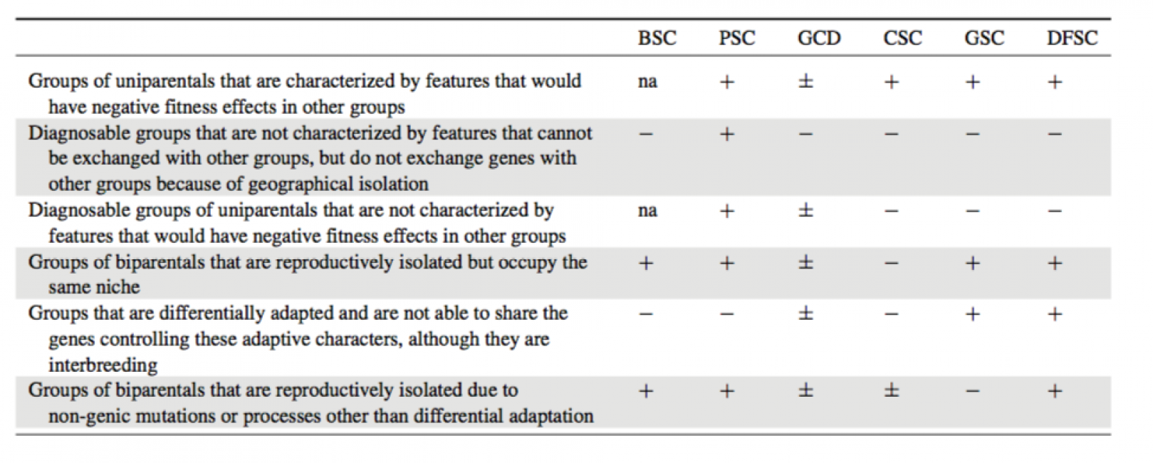 Classification de groupes d'individus en tant que espèces (+), habituellement des espèces (±) ou des espèces non différenciées (−) par différents concepts d'espèces (na, concept non applicable). BSC=biological species concept; PSC=phylogenetic species concept; GCD=genotypic cluster definition; CSC=cohesion species concept; GSC=genic species concept; DFSC=differential fitness species concept.