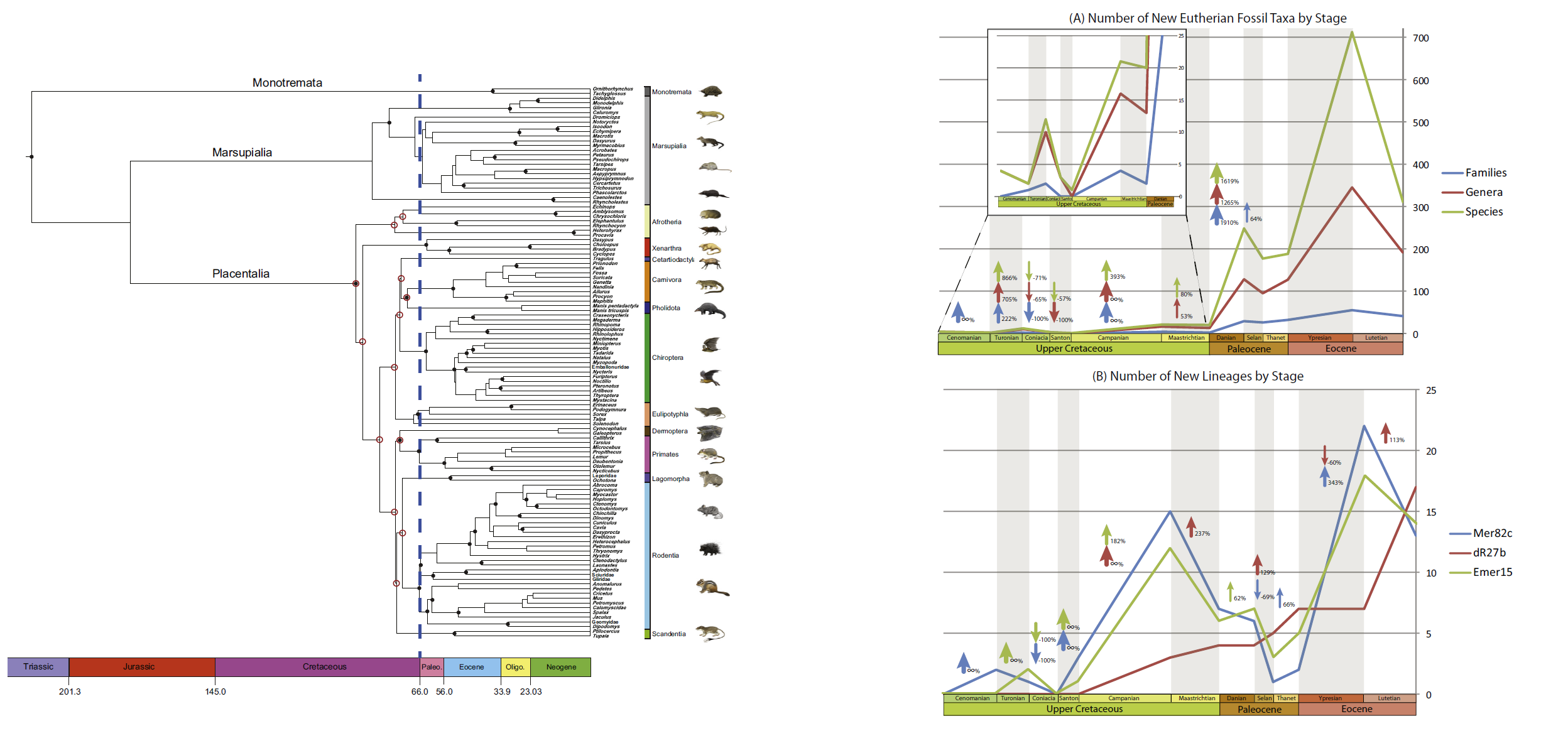 Modèle explosif (O'Leary et al., 2013), radiation inter et intra-ordinale après la crise Crétacé/Tertiaire : Euthériens non considérés de placentaires (pléontologues, études cladistiques écomorphologiques). Qualifié de "doux" avec apparition des principaux clades au Crétacé, mais principale diversification après.
