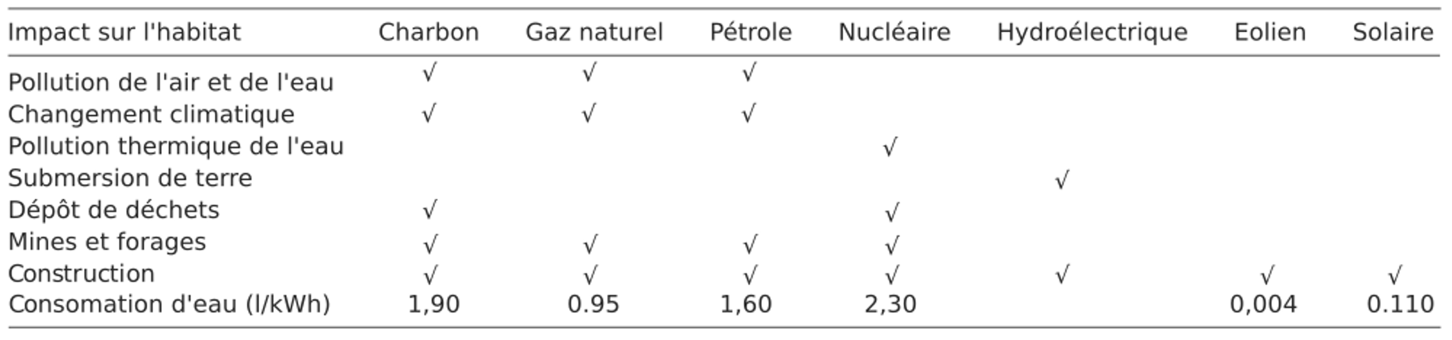 De plus, les énergies basées sur un cycle thermodynamique, énergies fossiles et nucléaire, consomment une importante quantité d'eau (Fig.1) et ont une zone d'impact qui dépasse l'emplacement des centrales. En effet l'exploitation des ressources fossiles, dont l'uranium, nécessitent des mines ou des forages, ainsi que des zones de retraitement ou d'enfouissement. L'énergie hydroélectrique implique une disparition de terres importante par la formation de la retenue d'eau. Enfin, l'éolien est moins consommateur d'eau et plus facilement installable que le solaire.