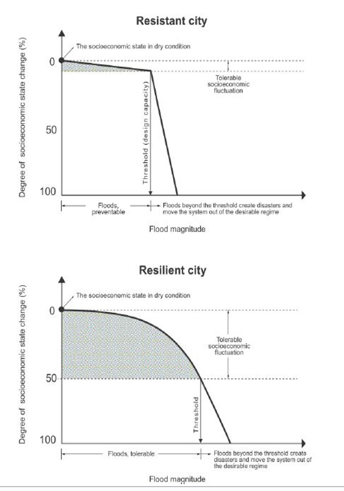 Au contraire, la ville résiliente tolère les inondations et une plus grande fluctuation des conditions socio-économiques, ce qui lui permet d'avoir un bassin plus grand et donc une plus grande résilience urbaine aux inondations. Liao 2012