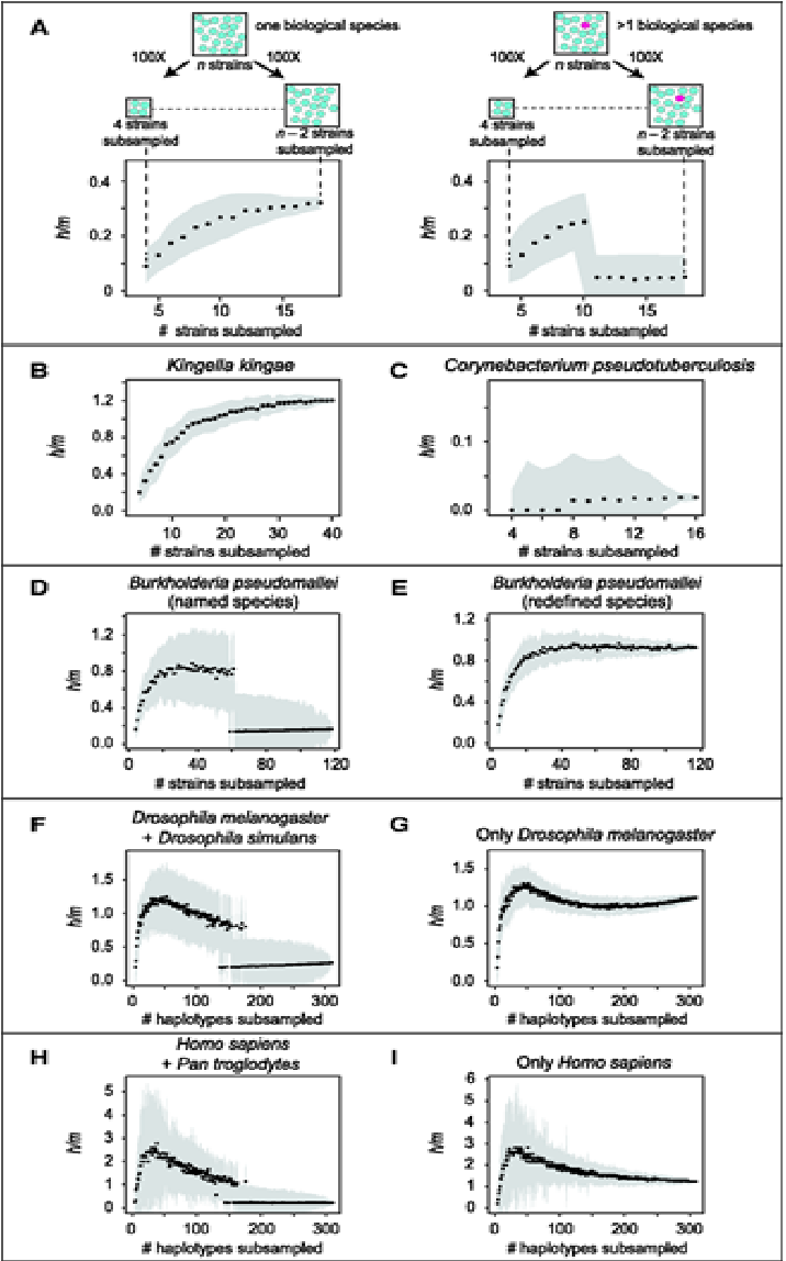 Reconnaissance d'espèces biologique par analyses génétique (A) “Schéma utilisé pour le test de flux de gènes”. A chaque itération, le ratio h/m a été calculé de façon aléatoire. Le graphique de gauche montre la distribution observée lorsqu'il n'y a pas de barrière au flux de gène entre les souches. Celui de droite montre le contraire. (B–D) “Patron d'échange génétique observé dans les espèces nommé de bactéries".(E) Représentation graphique de B. pseudomallei après retrait des souches isolé des autres, montrant l'existence d'espèce biologique (F–I) Verification de la méthode pour reconnaitre des espèces biologique par application sur des espèce animales à reproduction sexuelle stricte.