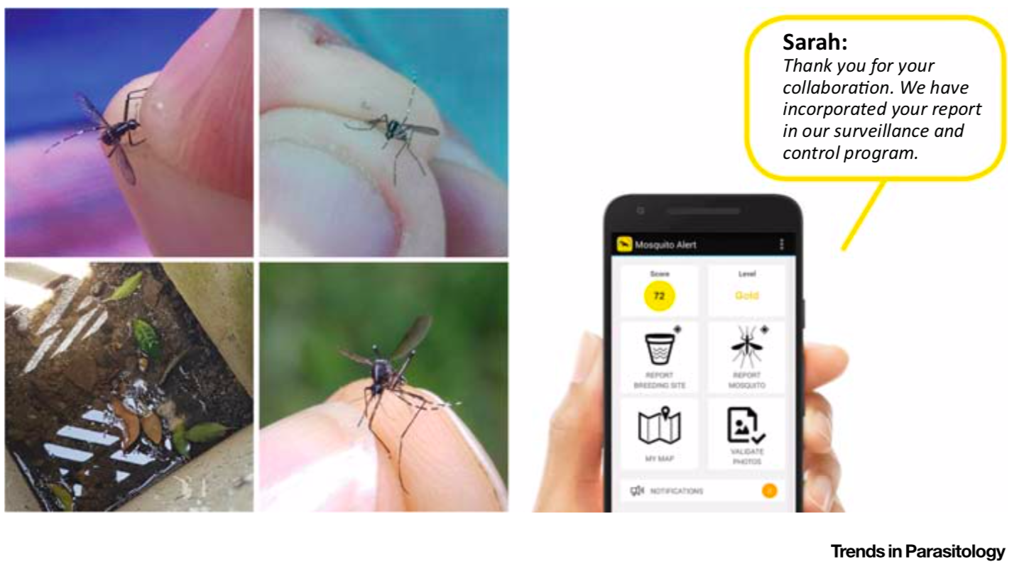 Dans cette revue, les auteurs s’appuient sur l’exemple de l’application « Mosquito Alert » (Figure 1), une étude basée en Espagne, afin de montrer comment cette dernière stimule l’innovation dans la prise de décision en santé publique et la gestion vectorielle quotidienne. Afin de faciliter la communication des informations entre les citoyens et les équipes de recherches, une application pour smartphone a donc été créé ainsi qu’un portail web. Les données envoyées par les participants (photographies de moustique, lieu de découverte, etc.) sont préalablement vérifiées et validées par des équipes d’entomologistes. Cette application permet de partager l’exploitation des informations sur les risques de maladie en temps réel.