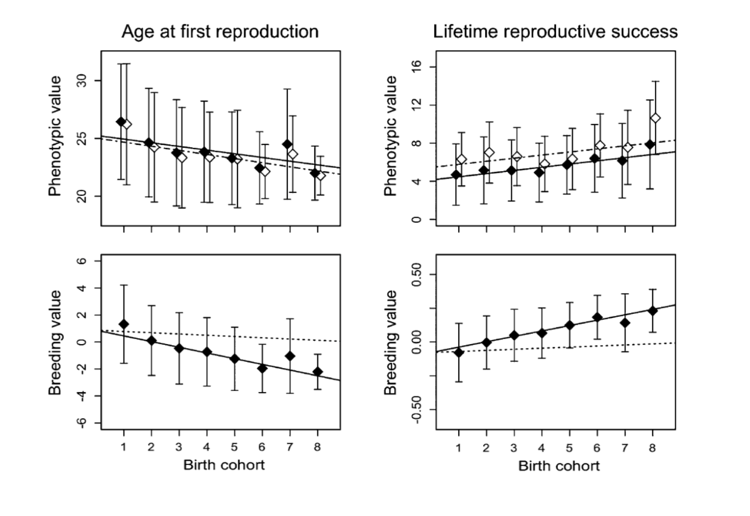 Cette étude révèle une corrélation forte et négative entre l'AFR et la Lifetime Reproduction Success (LRS: Nombre total de descendants au cours d'une vie) : plus l'AFR est précoce, plus la LRS est importante (Coefficient de régression standardisé : -0,51). On observe d'ailleurs sur la période de l'étude une augmentation de la LRS de 3 à 4 enfants et une diminution de l'AFR de 26 à 22 ans. Par implémentation bayésienne des données dans un modèle d'estimation de l'héritabilité, les auteurs ont montré que l' AFR est un caractère fortement héritable, contrairement à la LRS : respectivement 0,55 contre 0,04.