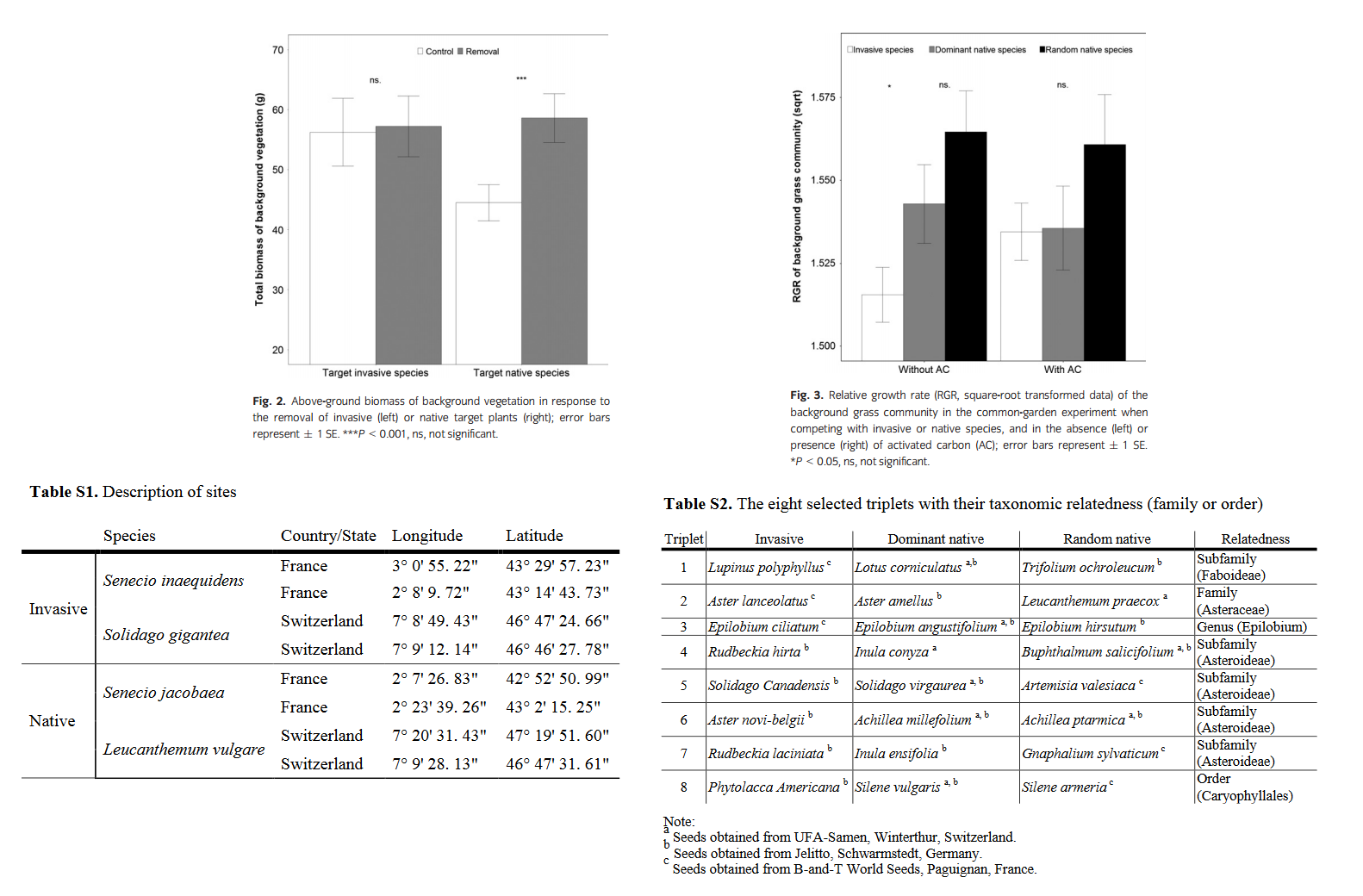 Methods: We first conducted a field removal experiment to compare the response of neighbouring communities to experimental biomass removal of two alien invasive vs two dominant native plant species in two sites of each target species (thus eight sites in total). In addition, we conducted a common garden pot experiment to compare the effect of eight triplets of closely related target species (24 species in total), each consisting of an alien invasive species in Europe, a dominant native and a random native species, on the growth of a grass community under the addition or not of activated carbon (AC).