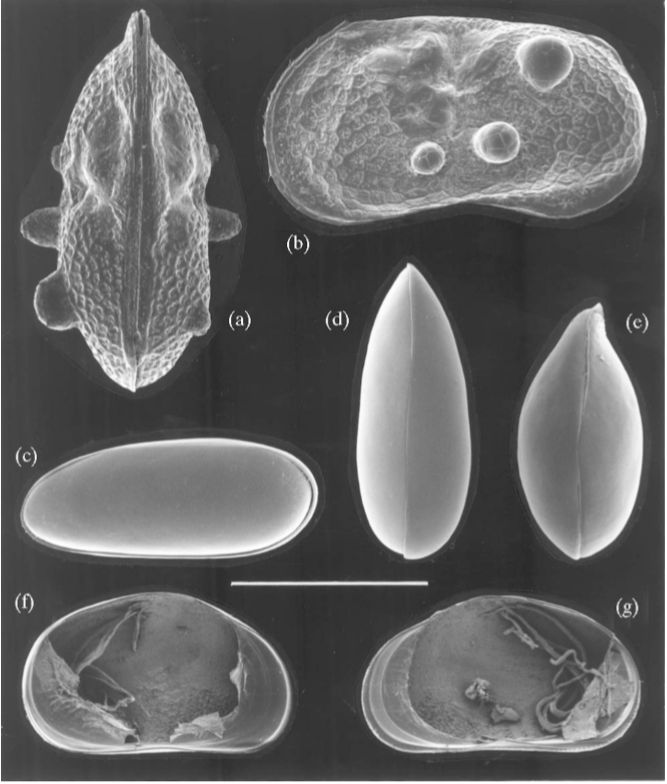 Figure représentant les valves et les carapaces de 3 superfamilles : Limnocythere (a,b), Darwinula (c,d) et Heterocypris (e,g) : a) carapace, vue dorsale b) valve gauche, vue extérieure, c) carapace: vue latérale gauche d) carapace, vue dorsale e) carapace, vue dorsale, f) valve droite, vue interne et g) valve gauche, vue interne
