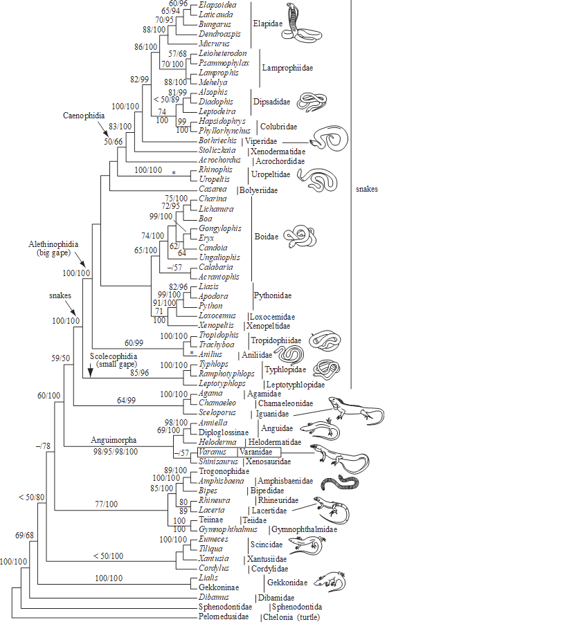 Figure : Relations phylogénétiques entre les serpents, lézards et les amphisbènes suivant les séquences d'ADN des gènes nucléaires RAG1 et Cmos.