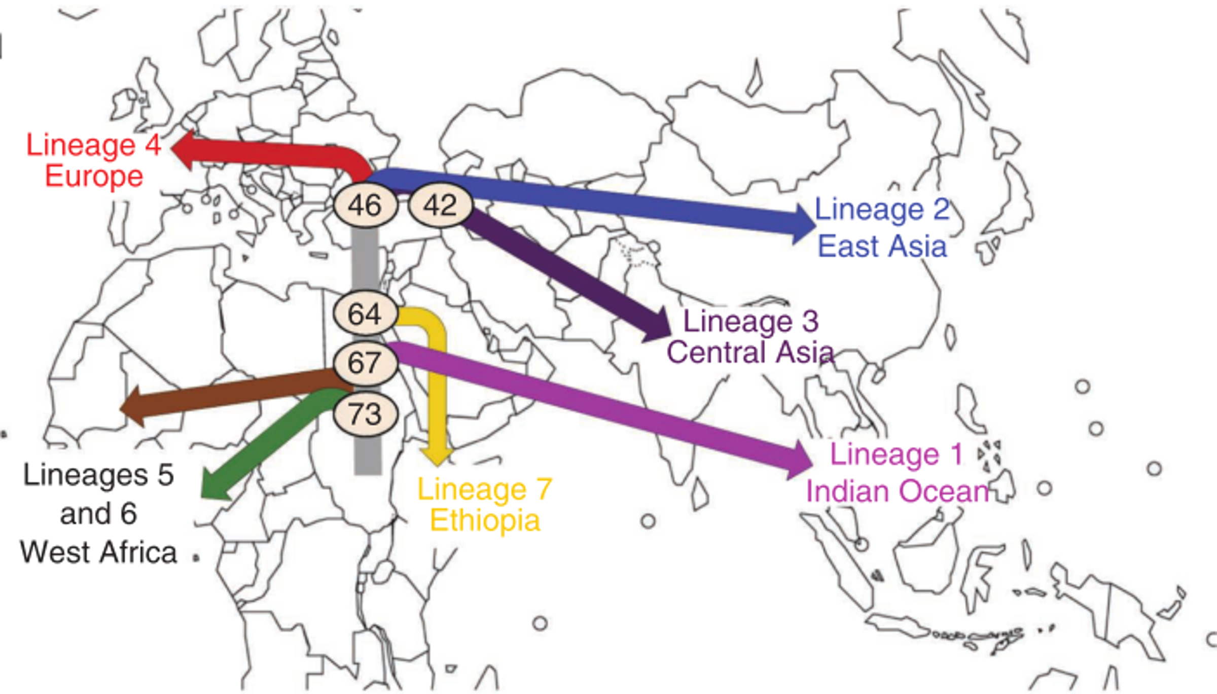 Le modèle phylogéographique de MTBC montre une importante corrélation avec un modèle de dispersion de l'Homme moderne fondé sur l'analyse de l'ADN mitochondriale. Résumé en figure 1, le modèle MTBC soutient à 95% une division de la lignée bactérienne il y a environ 67 000 ans BP. pouvant être associé à une première vague de migration. Puis une seconde il y a environ 46 000 ans BP. aussi soutenue à 95%, correspondants probablement à la dispersion au travers l'Eurasie.