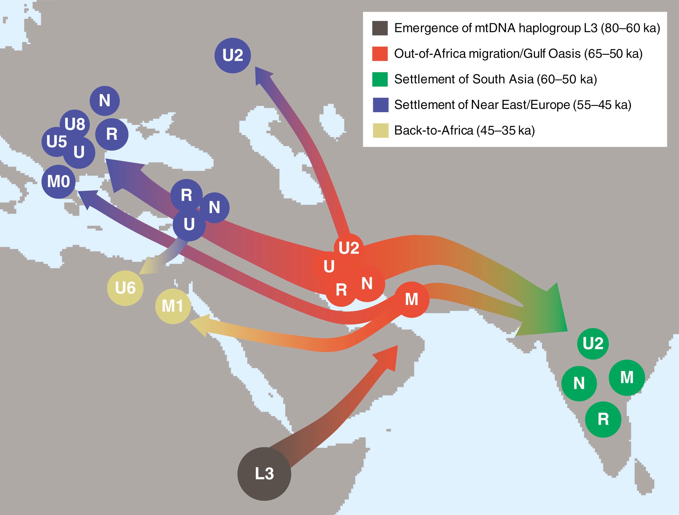 Le scénario illustré résume les preuves de mitogénomes modernes et anciens actuellement disponibles, reliant la nouvelle détection de M0 en Europe (Posth et al., 2016) avec des résultats antérieurs. Il montre une dispersion de l'Afrique de l'haplogroupe L3 de l'ADNmt africain, suivie par l'émergence des principaux haplogroupes M et N hors d'Afrique (et des descendants de N, R et U). De là, d'autres dispersions sont montrées : vers l'est en Asie du Sud et vers le nord-ouest dans le Croissant fertile, en Europe et en Afrique du Nord (Richards et al., 2016).