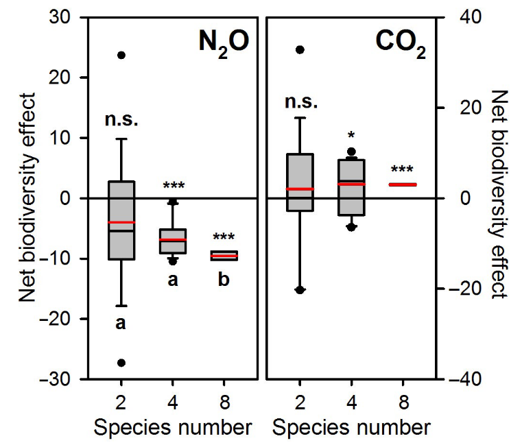 Il a été constaté qu'une plus grande richesse en espèces et une plus grande dissimilitude fonctionnelle des mélanges d'espèces entraînaient une augmentation des émissions de CO2 induites par la faune (jusqu'à 10 %), mais une diminution des émissions de N2O (jusqu'à 62 %).