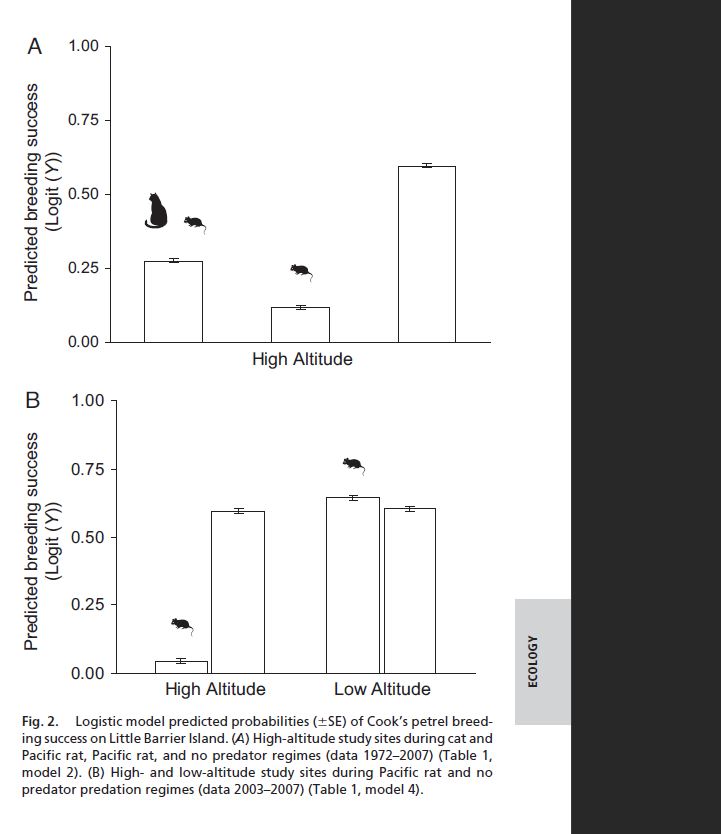 Dans cet article c'est little barrier island, proche de Nouvelle-Zélande qui est étudiée, on y trouve un système à prédateur invasif Felis cattus/Rattus exulans réduisant fortement le succès reproductif u Petrel de Cook (Pterodroma cookii).