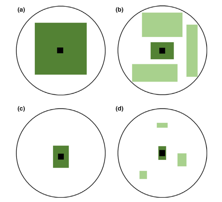 Par exemple, en considérant deux parcelles (Figure 1) : une située dans un grand espace, entouré de peu d’habitat (Figure 1a), et une située dans un espace plus petit, entouré de beaucoup d’habitat (Figure 1b) ; L’HAH suggère que la densité d’espèces est équivalente dans les deux cas, tant que la quantité d’habitat disponible est la même. Par extension, l’HAH prédit que la fragmentation comme définie par les auteurs (conformation de l’espace dans lequel l’habitat est constituée de multiples parcelles isolées) n’a pas d’effet.