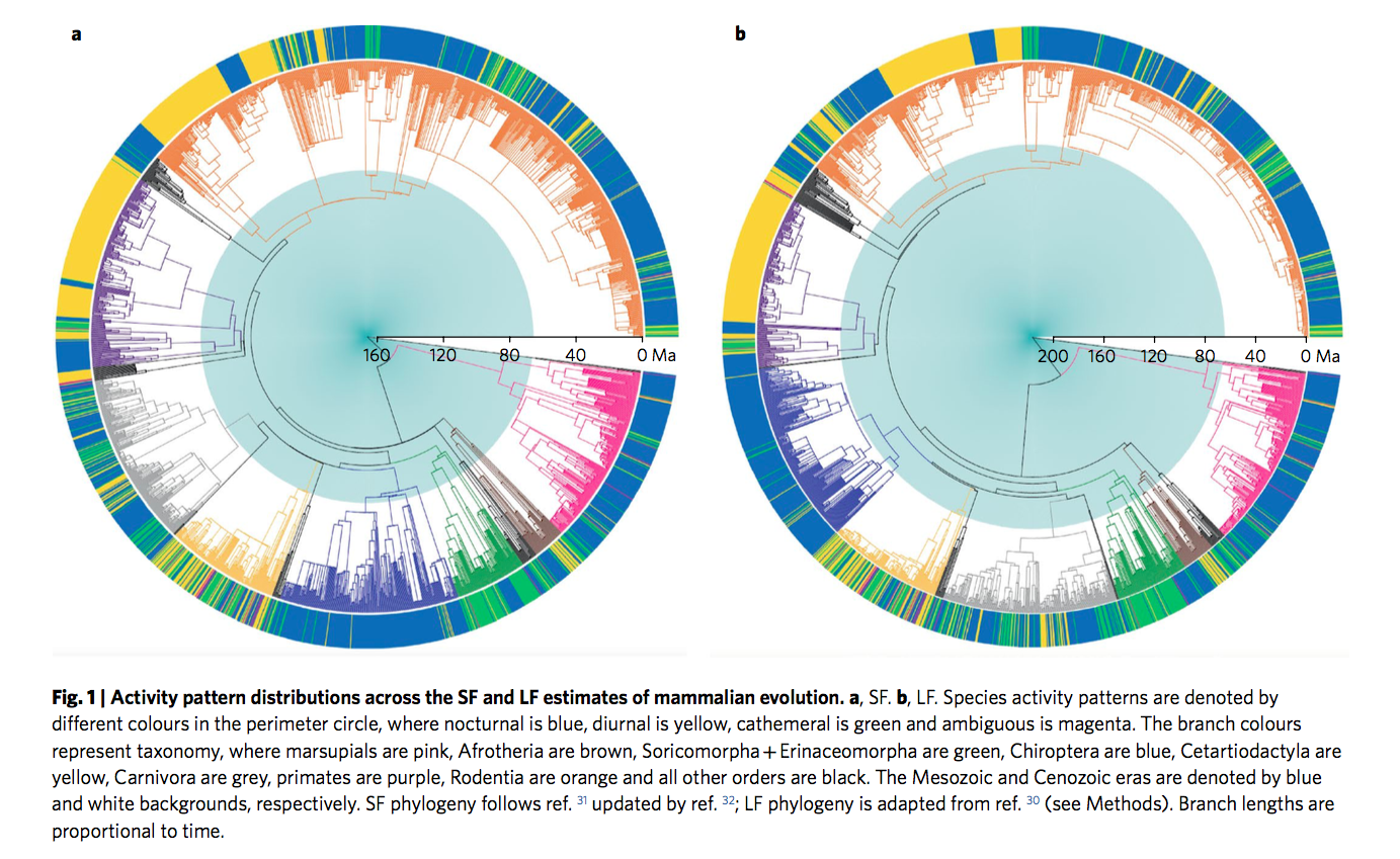 a, SF. b, LF. Les patrons d'activité des espèces sont indiqués par des couleurs différentes dans le cercle du périmètre, où nocture est bleu, le diurne est jaune, le cathéméral est vert et ambigu est magenta. Les couleurs des branches représentent la taxonomie, où les marsupiaux sont roses, les Afrotheria sont bruns, les Soricomorpha + Erinaceomorpha sont verts, les Chiroptera sont bleus, les Cetartiodactyla sont jaunes, les Carnivora sont gris, les primates sont violets, les Rodentia sont orange et tous les autres ordres sont noirs. Les ères mésozoïque et cénozoïque sont désignées respectivement par des fonds bleus et blancs. La phylogénie SF suit la réf. 31 mis à jour par ref. 32; La phylogénie LF est adaptée de la réf. 30 (voir Méthodes). Les longueurs de branche sont proportionnelles au temps.