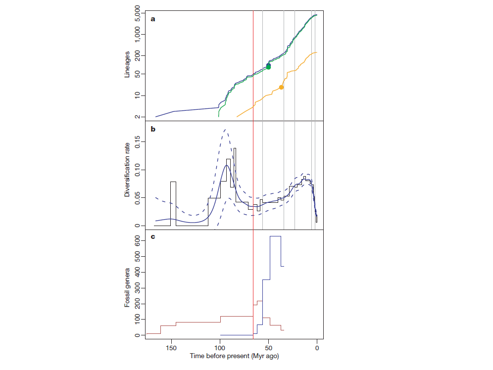 Les taux de diversifications sont ensuite restés constant à travers la crise K-Pg, qui n'aurait alors eu qu'un effet très faible sur ces taxons. Avant de recroître fortement dans le Paléogène avec notamment les optimum thermiques du Cénozoique et climatique début l'Eocène (55-50MA).