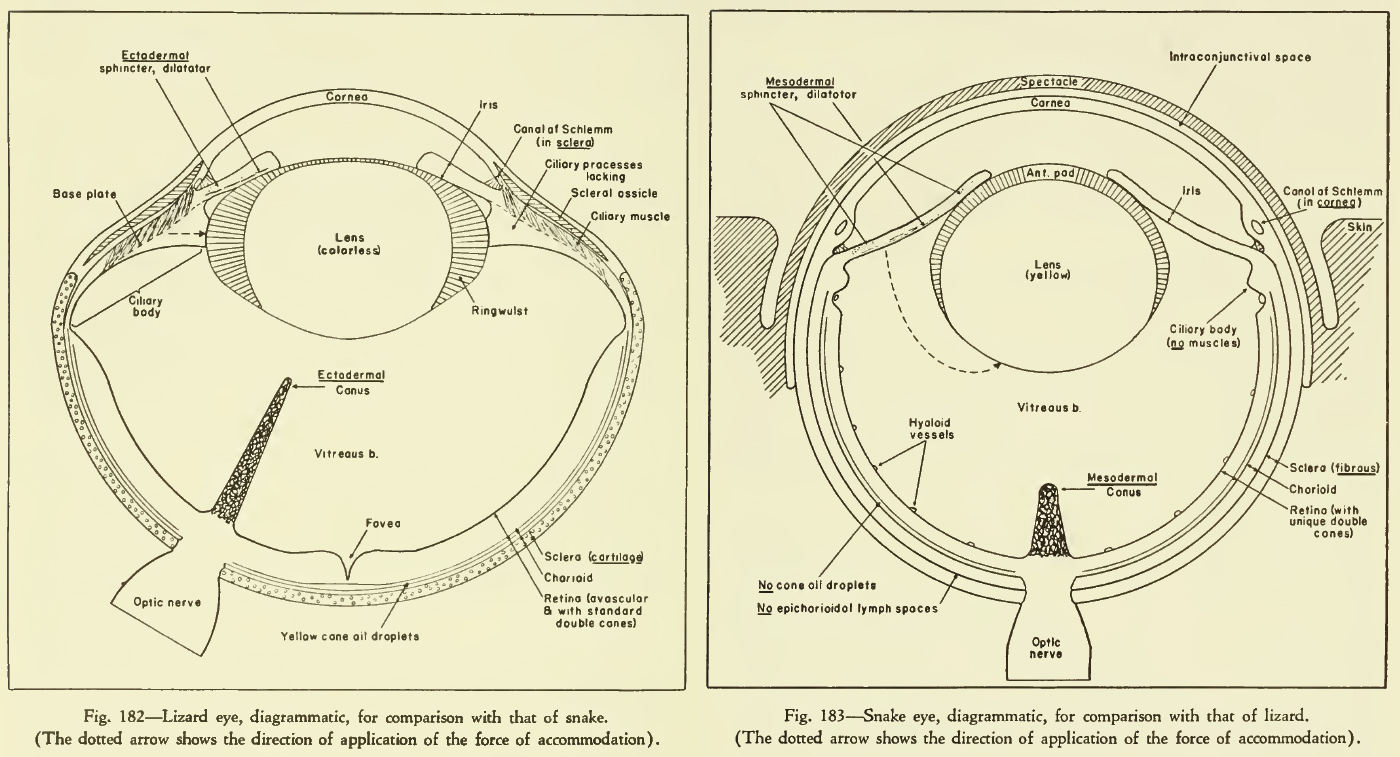 L'étude de la structure de l’œil est une approche très intéressante et qui semble nécessaire pour comprendre l'évolution des serpents. Ce livre datant de 1942 montre que l'on s'intéresse depuis déjà un certain temps aux hypothèses de leur origine.