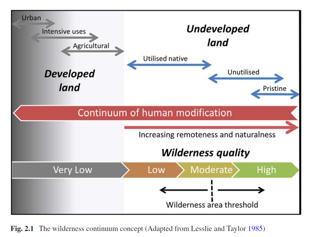 Lesslie et Taylor (1985) ont poussé cette approche plus loin en introduisant le concept de continuum de nature sauvage, en soutenant que ce qui caractérisent la nature sauvage est l'éloignement et le caractère naturel. Ainsi ils définissent la qualité de la nature sauvage comme la mesure dans laquelle un endroit est éloigné et non perturbé par les influences de société car il n'y a pas de zones absolument inaccessibles et non perturbées sur Terre. Le concept du continuum de la nature sauvage aide à concilier diverses interprétations de la nature sauvage et des vues modernes de l'importance écologique de vastes zones naturelles intactes, et il fournit une base pour l'identification et l'évaluation de ces ressources.
