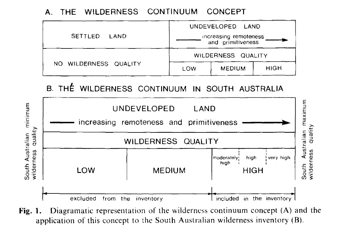 Several Australian studies have inventoried wilderness in the comparatively high rainfall environments of the eastern States and Tasmania. These inventories have made a valuable contribution to Australian wilderness preservation. However, it is argued that the procedures developed for these inventories have failed to recognise the true nature of wilderness. In addition, although the major portion of Australia's wilderness resource occurs in the arid interior of the continent, established inventory procedures are not readily, applicable to the environments characteristic of this arid zone. A recently completed inventory of high quality and mainly semi-arid or arid wilderness areas in South Australia has attempted to overcome the deficiencies of previous Australian inventories. The theoretical basis of the South Australian inventory is the wilderness continuum concept; that is, the concept that wilderness is a continuum of remote and primitive.