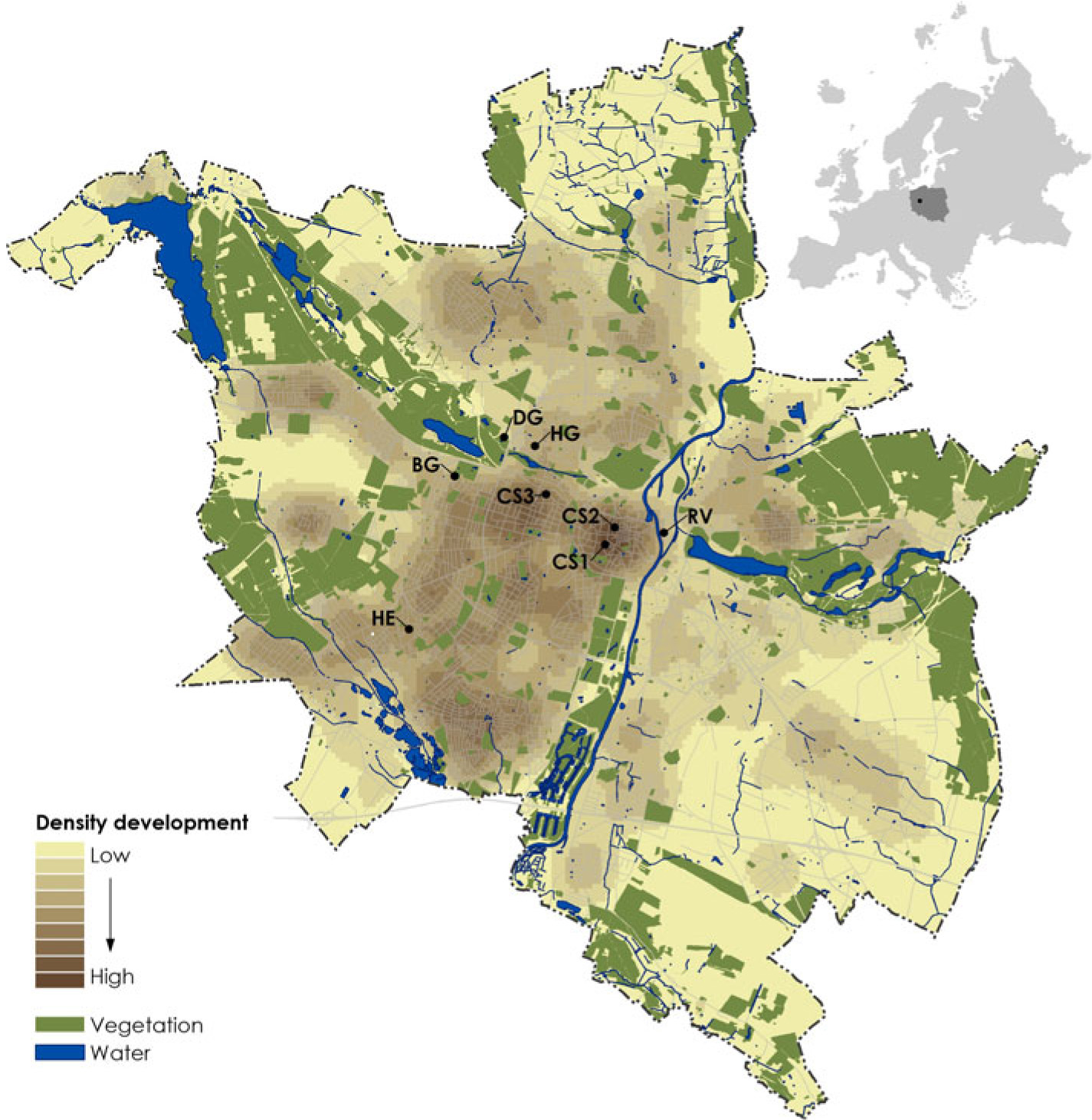 Location of study plots in Poznan (City centre: CS1, CS2, CS3 concentrated settlements of tenement houses, RV river meadow close to concentrated settlements ; Suburbs: HG Home garden located in a district of detached houses, HE sparse housing estate, DG Dendrological Garden, BG Botanical Garden)