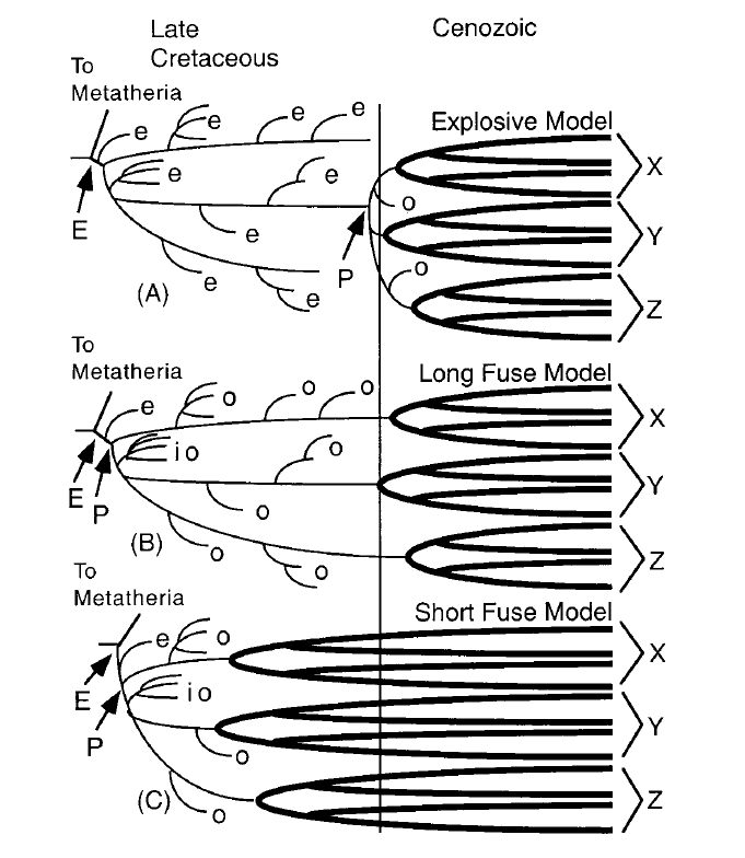 • Le modèle explosif (Explosive Model) implique une diversification inter et intra-ordinale des euthériens modernes après la crise K-Pg. L’ancêtre commun des placentaires actuels, selon ce modèle, alterne entre une position post-K-Pg (Hard Explosive Model) ou pré-K-Pg (Soft Explosive Model).