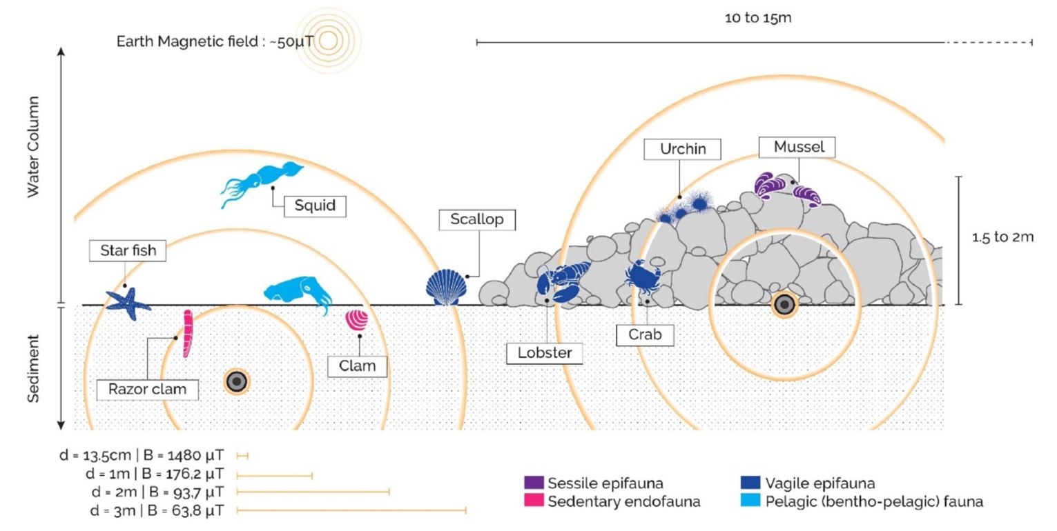 Pour pallier à la demande croissante en énergie renouvelable ces dernières décennies, l’installation de Dispositifs Marins d’Energie Renouvelables (MRED) et de réseaux de communications en haute mer a conduit en parallèle à la mise en place de câbles de transmission qui rejoignent le continent, émettant à leur surface des champs électromagnétiques où vivent des espèces benthiques et pélagiques. A priori, nombre de ces organismes sont électrosensibles, et utilisent le champ magnétique (MF) terrestre d'une intensité d'environ 50 µT dans leur orientation [1]. Les effets potentiels des MF émis lors du passage du courant sur les faunes marines sont sujets à un débat n’ayant pas encore abouti à un consensus clair au sein de la communauté scientifique, et ce malgré des travaux précisant les réponses de différentes espèces à ce possible stress à travers plusieurs variables. Le conflit sous-jacent entre des enjeux environnementaux et économiques trouvant échos en société renforce d'autant plus la nécessité d’étudier cette controverse.