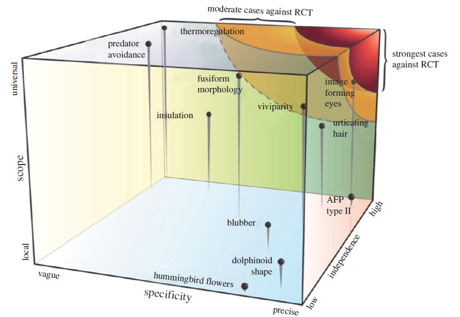 La RVL présente des RE obtenus de manières répétées dans plusieurs scénarios évolutifs indépendants (convergences[6]) dus à des optimums adaptatifs similaires et/ou des propriétés structurelles dominantes. Ces convergences soutiennent la RVL et témoignent de i) la prévalence de la sélection naturelle et ii) que l'espace des formes possible est fini[3].