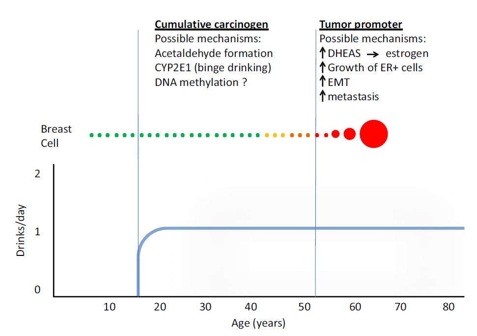 L'alcool pourrait être un promoteur de la progression de cancer pré-existant, du fait que le développement du cancer du sein nécessite une durée souvent plus longue que la période d'observation. L'hypothèse des œstrogènes est nuancée par les auteurs et d'autres effets comme la méthylation de l'ADN sont à étayer.