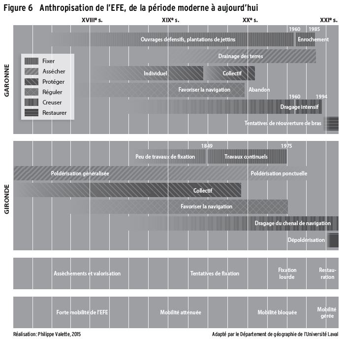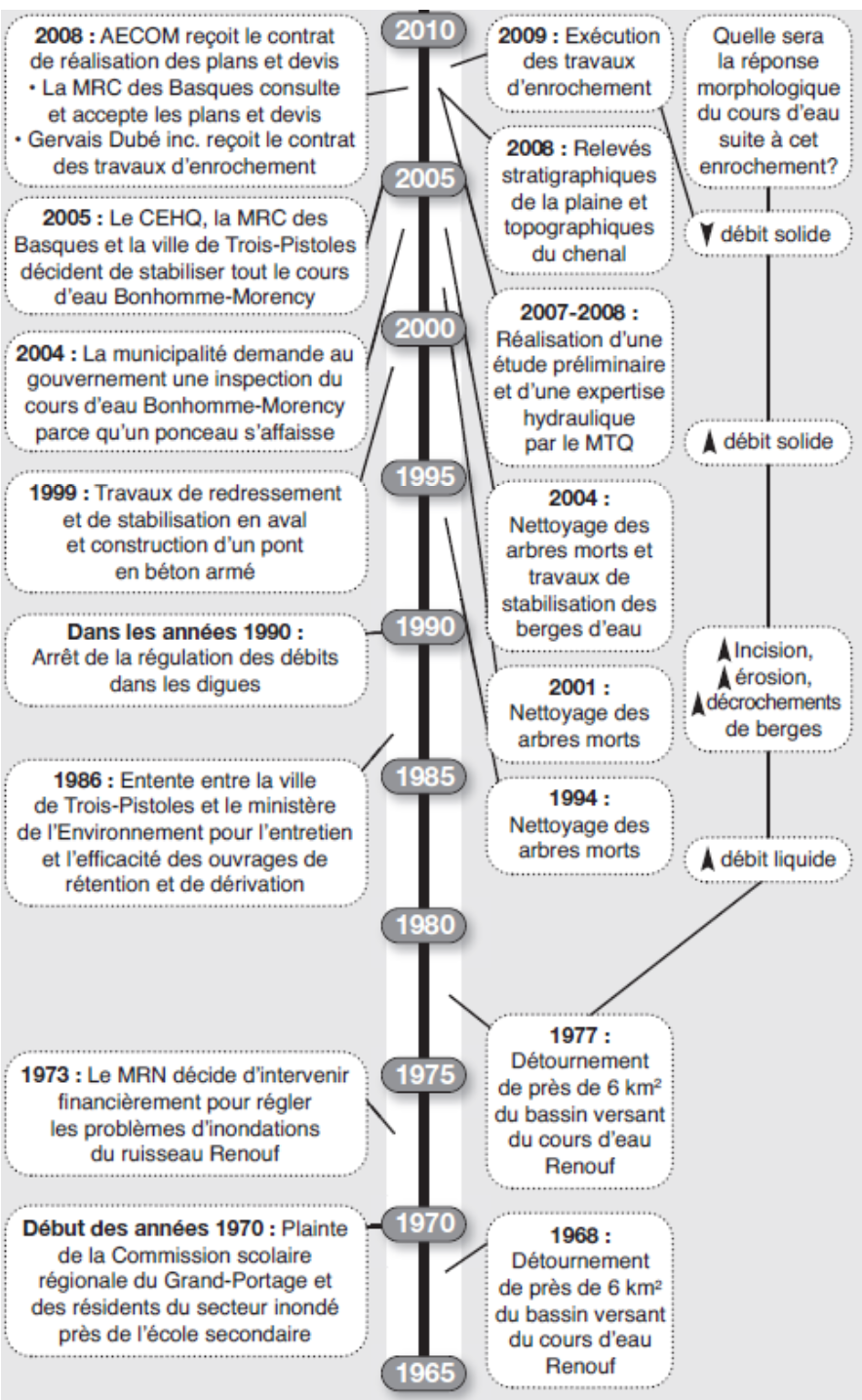 Quand les sciences de la Terre et de l’eau ont été davantage intégrées aux études de gestion fluviale, elles ont permis d’apporter de nouveaux éléments de compréhension13. Des phénomènes liés à la régulation des flux, comme la déstabilisation de la charge fond, ou l'accélération des débits de crue, ont été révélés. D’autres domaines comme l’histoire et l’écologie ont amélioré la pertinence des études de terrain en considérant l’échelle temporelle et spatiale. Il est maintenant possible de combiner ou de développer plusieurs indices descripteurs, afin de savoir quand et quel(s) événement(s) est à l’origine de modifications hydromorphologiques. L’histoire apporte le recul nécessaire qui manquait dans les plans de gestion fluviale des années 19701.
