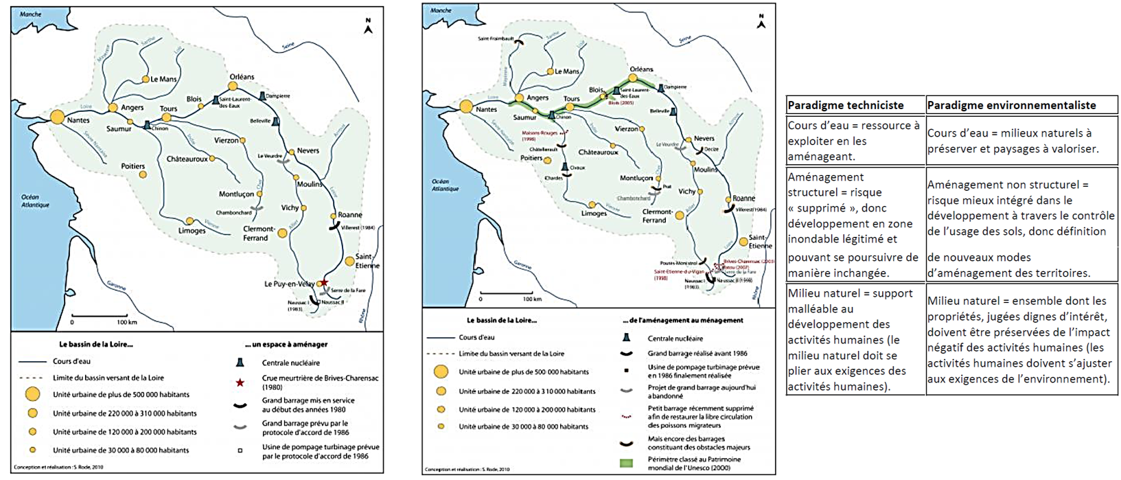 L’expansion des villes a entraîné la construction d’infrastructures dans des zones inondables, augmentant ainsi les dégâts et l’intensité des inondations14,17,7,5. Les constructions de différents aménagements se succèdent, entraînant parfois un déplacement des problèmes7. Pourtant, de nombreux acteurs (habitants, politiciens, scientifiques, etc.) promeuvent l’importance de ces aménagements pour lutter contre les inondations7,17. Le « paradigme techniciste » est donc essentiel pour certains acteurs (comme les aménagistes ou certains élus). Il permettrait de stopper les inondations grâce à des moyens techniques comme les digues. Le milieu naturel est donc perçu comme support malléable au développement des activités humaines11. En revanche, avec le changement climatique et la prise de conscience écologique, un paradigme est apparu. Il devient nécessaire de considérer les conséquences écologiques des aménagements fluviaux, comme la destruction des habitats, ou encore la modification des cycles hydrologiques. Ce paradigme dit « environnementaliste » prône la restauration des cours d’eau de façon plus ou moins intense allant, d’après Brun et al 20149, de la “diversification” à la “renaturation”. Elle est définie comme une action volontaire et planifiée dans une logique intégratrice des facteurs environnementaux (naturels et anthropiques) favorables au maintien des fonctions naturelles du cours d’eau9. Nous allons dans un premier temps étudier les deux paradigmes distinctement puis questionner si une possible association entre le génie civil traditionnel et l’écologie est envisageable.