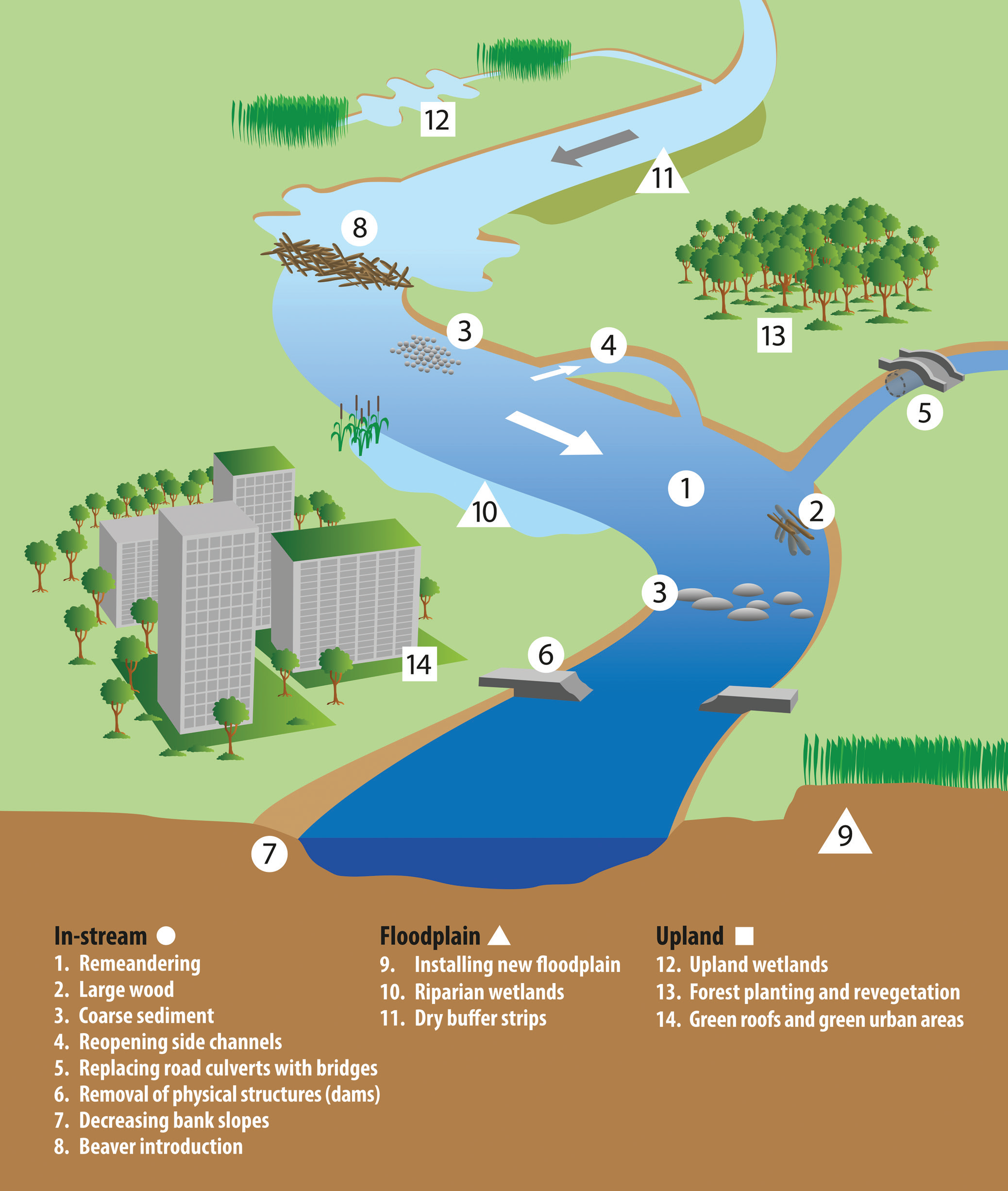 Face à l’état de dégradation des cours d’eau à l'échelle globale, de nombreux projets de réhabilitation écologique ont émergé. Ceci est lié à la prise de conscience de la perte de biodiversité, de l'augmentation de la pollution et de la perte d’habitats riverains (plaines alluviales, zones humides)17. Ces projets n’ayant pas pour premier objectif le contrôle des crues, leurs méthodes se sont avérées convergentes avec la régulation du débit et la résilience face aux inondations.