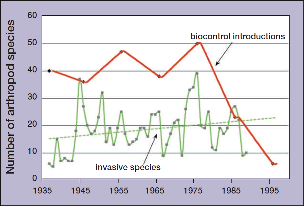 La lutte biologique1 via l’introduction d’agents de contrôle exogènes contre les espèces invasives a ainsi été mise en place assez précocement dans une optique agricole et économiques. Dans les années 1990, les mentalités ont changées avec l’observation des résultats des introductions déjà réalisées ; résultats allant de très satisfaisant à complètement désastreux (Louda et al., 1997, Ecological Effects of an Insect Introduced for the Biological Control of Weeds; Suckling, 2013, Benefits from biological control of weeds in New Zealand range from negligible to massive: A retrospective analysis ; Gross et al., 2017,Unsuccessful introduced biocontrol agents can act as pollinators of invasive weeds: Bitou Bush ( Chrysanthemoides monilifera ssp. rotundata ) as an example). La vraie opposition est alors née entre ceux mettant en avant les risques de telles pratiques et ceux considérant ces pratiques comme avantageuses dans le cadre d’un contrôle biologique. Cela dit, la grande majorité du monde scientifique s’accordent aujourd’hui sur la nécessité croissante de correctement déterminer la balance idéale entre les bénéfices et les coûts (e.g. risques) de la lutte biologique (Baratt, 2011, Assessing safety of biological control introductions). Cela en se questionnant aussi sur les coûts de la non-introduction pour l’écosystème face aux coûts de l’introduction.