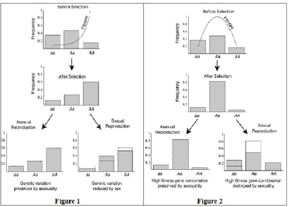 Cependant, la grande majorité des espèces se livrent à la reproduction sexuée, mais les forces évolutives qui font que le sexe est répandu dans la nature restent encore mal comprises. En principe, l’asexualité devrait être plus efficace : elle évite les coûts liés à l’accouplement et permet aux individus de transmettre la totalité (plutôt que la moitié, ) de leur matériel génétique à leurs progénitures. L’un des avantages potentiels du sexe en matière d’évolution est que la recombinaison peut accélérer l’adaptation, via la génération de variations nécessaires à la sélection (Ridley, 1997). En effet, dans un environnement changeant, les individus les mieux adaptés survivent, et les individus portant des mutations défavorables dans leur génome sont éliminés. Au contraire, les individus générés par reproduction asexuée ont un génome clonal. Une mutation délétère qui apparaît ne peut disparaître sauf sous l’effet d’une mutation reverse qui est extrêmement rare, les individus porteurs meurent.