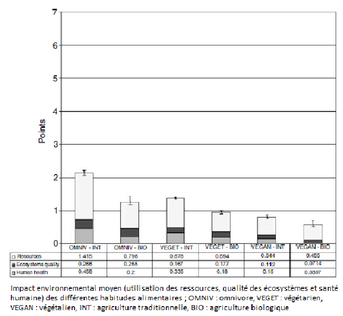 Selon certaines études, un changement de régime alimentaire privilégiant la consommation de produits végétaux, pourrait être une stratégie à adopter pour tendre vers une agriculture durable. Cependant, les effets de l’adoption d’un régime strictement végétarien ou végétalien semblent encore controversés. Néanmoins, il est indéniable que la réduction de la consommation de protéines animales aurait un impact positif sur l’utilisation des terres [8]. De plus, l’optimisation de l’élevage résiderait dans l’utilisation de produits non comestibles pour l’homme dans l’alimentation des animaux d’élevage (conversion de co-produits: paille, colza, pulpe de betterave, etc.) et l’utilisation de terres marginales impropres aux cultures (absence de concurrence entre les productions végétales et animales).