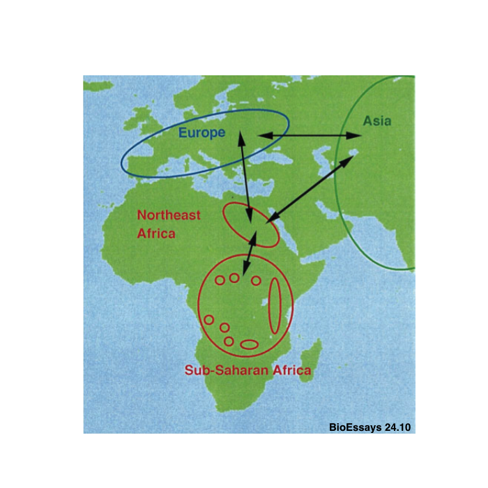 En Afrique, il semblerait que la population soit isolée jusqu’à environ 100 000ans et diverge génétiquement entre 100 000 et 50 000ans. Les populations eurasiennes actuelles ont une variabilité inférieure aux populations africaines, ce qui pourrait être facilement expliqué par le fait que des populations qui auraient migré en Eurasie n'apporteraient qu’une fraction de la variabilité génétique des populations ancestrales, pendant qu’en Afrique la diversification continuerait.