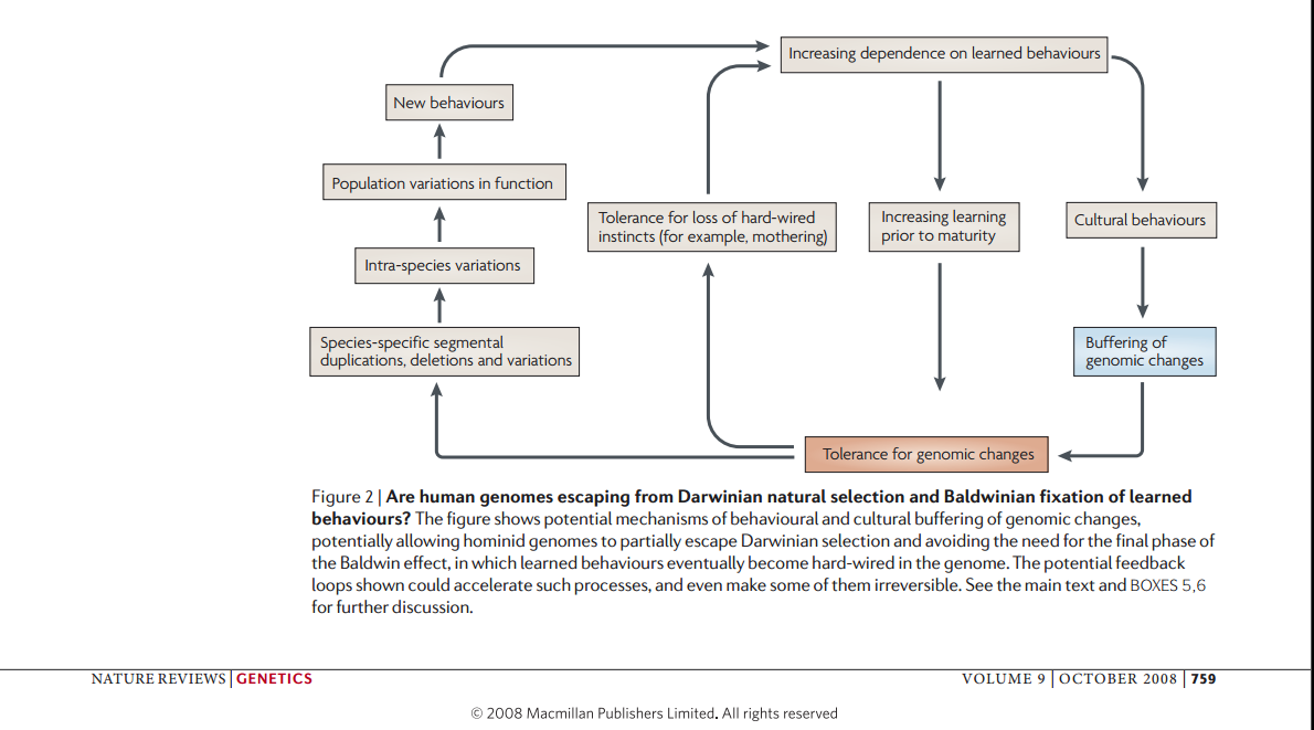 Cependant, un certain nombre de références présentent un avis plus modéré. Certaines études montrent en effet une relation plus complexe entre le génome, l’environnement et les pratiques de l’Homme. C’est notamment le cas pour une étude portant sur des femmes européennes Kirk et al. 2001, qui conclut à des traits d’histoire de vie toujours soumis à la sélection naturelle (héritabilité de la fitness ; sélection en faveur d’un âge de première reproduction inférieur, un âge de ménopause supérieur), mais qu’un autre (âge des premières menstruations) pourtant reconnu comme soumis à cette sélection (populations préindustrielles) ne l’est plus actuellement en raison de l’influence culturelle. On constate également un relâchement de la sélection sur le poids à la naissance. L’augmentation de l’encadrement médical a ainsi diminué la pression sélective exercée sur l’individu en fonction de son poids à la naissance et par conséquent les taux de mortalité à l’accouchement Ulizzi et Terrenato 1992. Plus récemment Galor et Moav 2005, il a été montré que la révolution agricole avait dans un premier temps augmenté la mortalité, mais ensuite permis la création d’un potentiel génétique d’adaptation. Les maladies étant mieux soignées et ce potentiel génétique disponible permettent ainsi l’augmentation de l’espérance de vie. En lien avec l’évolution de la population, la croissance démographique exceptionnelle de l’Homme permet la création de plus de mutations génétiques qui seront par la suite sélectionnées Hawks et al. 2007. Cette accélération est mise en relation avec la culture et le comportement qui prennent une part de plus en plus importante dans les processus évolutifs humains Varki et al. 2008 réduisant ainsi le poids de la sélection naturelle. La langue est un exemple de pression sélective culturelle et impacte de façon significative la variation génétique entre individus Laland et al. 2010 ; Toussaint et al. 2012. La culture étant héréditaire et évoluant à une échelle de temps bien plus courte que l’évolution génétique des populations, elle constitue donc un moteur évolutif plus puissant. Selon certains auteurs, la culture serait donc au centre de l’évolution pour l’Homme, mais aussi les autres espèces Laland et al. 2010 ; Toussaint et al. 2012.