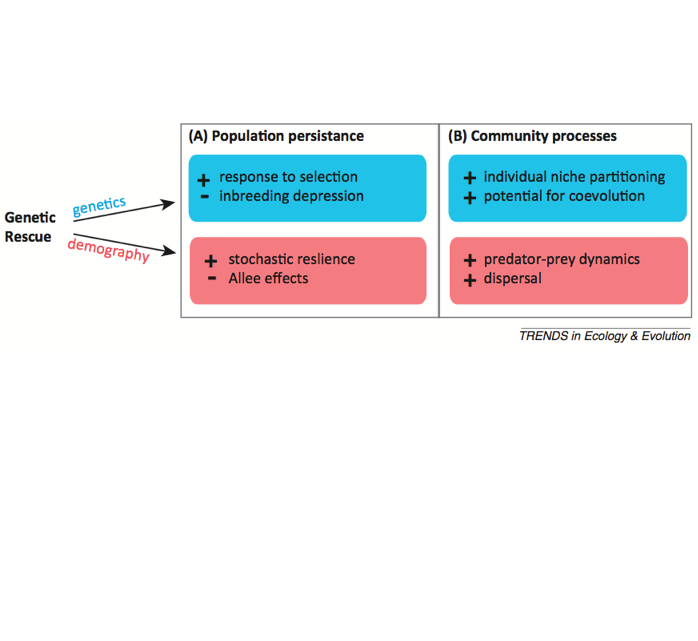 La diversité génétique peut malgré tout se maintenir par des flux géniques entre populations. Certaines études mettent alors en avant le potentiel du sauvetage génétique pour la biologie de la conservation. Cette stratégie consiste à établir (ou à rétablir) des flux de gènes via l'immigration (Whiteley et al. 2015). De ce fait, l'hybridation (immigrants-natifs) permettrait de réduire la consanguinité et de restaurer la diversité génétique dans les populations menacées. Cela devrait ainsi augmenter la valeur sélective de ces dernières et permettre leur croissance démographique. Malgré la réussite du sauvetage génétique dans certains cas d'étude, d'autres recherches soulignent les nombreux risques liés à l'hybridation. Cette stratégie est donc rarement appliquée et reste controversée.