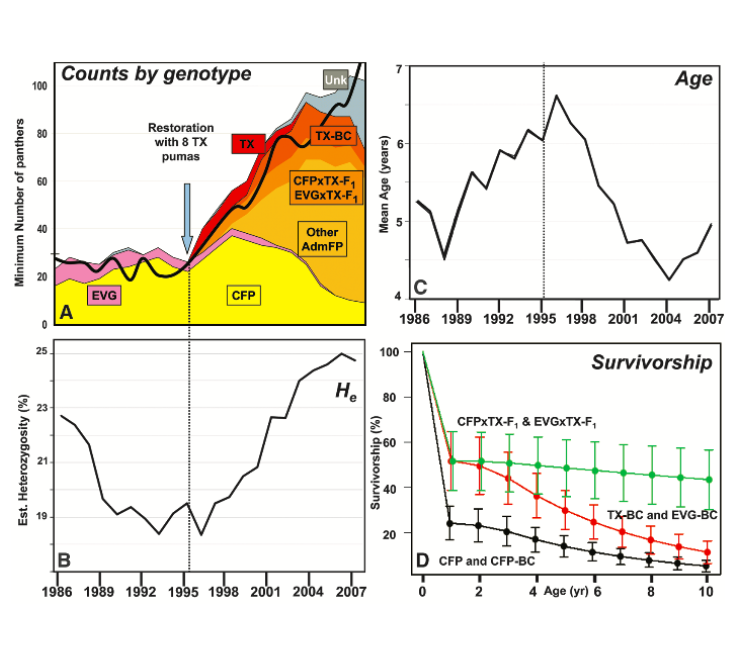 De nombreuses populations isolées sont sujettes à la consanguinité, à la perte de diversité génétique et à des risques d'extinction élevés. Certaines études mettent alors en avant la possibilité de sauver génétiquement ces populations via l'hybridation[6][12]. Cette stratégie, appelée "sauvetage génétique", se concentre sur la réduction de la consanguinité, la restauration de la diversité génétique, et donc sur le maintien du potentiel évolutif dans les populations menacées d'extinction[1]. Dans ce contexte, l'hybridation pourrait ainsi entraîner une augmentation de la fitness et permettre la croissance démographique des populations. Le sauvetage génétique peut tout d'abord se produire par hétérosis, lorsque les hybrides ont une fitness plus élevée que les lignées parentales[16]. Ceci est en général attribué à la superdominance (avantage des hétérozygotes) ou au masquage des caractères récessifs délétères[5][12]. Dans ce cas, la descendance hybride permettrait de réduire la dépression de consanguinité ainsi que le fardeau de la dérive et donc d'augmenter les taux démographiques vitaux par rapport à la population d'origine. Ensuite, le sauvetage génétique peut se produire par évolution adaptative, lorsqu'un changement vers un phénotype optimal est observé dans la population en raison de la sélection sur les génotypes nouvellement introduits ou recombinés[1]. Le sauvetage génétique représente donc une augmentation de la fitness de la population déduite de certains taux démographiques vitaux, plus que ce qui peut être attribué à la contribution démographique des immigrants[12]. De plus, le sauvetage génétique est très lié au concept de sauvetage évolutif, décrivant une augmentation de la croissance d'une population résultant de l'adaptation à un stress environnemental. Une variabilité génétique suffisante est cependant nécessaire afin que les populations puissent s'adapter face aux changements environnementaux. Il est alors peu probable que le sauvetage évolutif soit efficace pour les populations possédant une faible diversité génétique et des coefficients de consanguinité élevés. Certaines études ont donc montré que l'hybridation, en restaurant la variation génétique, pourrait faciliter le sauvetage évolutif et avoir ainsi un rôle important dans l'adaptation des populations[1][17]. Les avantages de l'hybridation en biologie de la conservation ont d'ailleurs été mis en évidence dans plusieurs études empiriques. En effet, les sauvetages de populations menacées de loups scandinaves[18], de vipères pléiades[19], d'opossums nains des montagnes[20] ou encore de renards polaires[21] témoignent de la réussite de cette stratégie. Le cas le plus connu est sûrement celui de la panthère de Floride, où la population a triplé après l'effort de translocation[22].