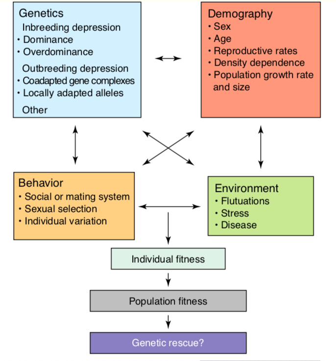 De nos jours, les pressions anthropiques qui s'exercent sur les écosystèmes ne cessent d'augmenter[1]. De nombreuses espèces sont alors soumises à des changements environnementaux ainsi qu'à la perte et à la fragmentation de leur habitat. Ces menaces amplifient l'isolement entre les populations et affectent la viabilité ainsi que le potentiel évolutif de ces dernières[2][3]. Les conséquences sont alors néfastes, pouvant aller d'une "simple" diminution de l'effectif d'une population à l'extinction de celle-ci. D'une part, si les populations sont petites et isolées, le risque de reproduction entre individus apparentés augmentera inéluctablement, pouvant de ce fait entraîner une dépression de consanguinité et une baisse de la valeur sélective[4][5]. À court terme, la consanguinité est donc la principale menace à laquelle sont confrontées ces populations[2]. D'autre part, une diminution de la taille d'une population augmentera les effets de la dérive, ce qui entraînera la fixation et l'accumulation d'allèles délétères (fardeau de la dérive) ainsi qu'une baisse de la diversité génétique. Cette dernière est cependant nécessaire pour que les populations puissent faire face aux changements environnementaux. Une diminution de la variation génétique induit donc une baisse du potentiel d'adaptation[2][3]. Ainsi, une détérioration génétique s'installera et même si les menaces initiales disparaissent, celle-ci va persister et conduira à une détérioration démographique de la population (vortex d'extinction). Atténuer les problèmes génétiques des populations menacées est donc devenu un sujet important en sciences de la conservation[2].